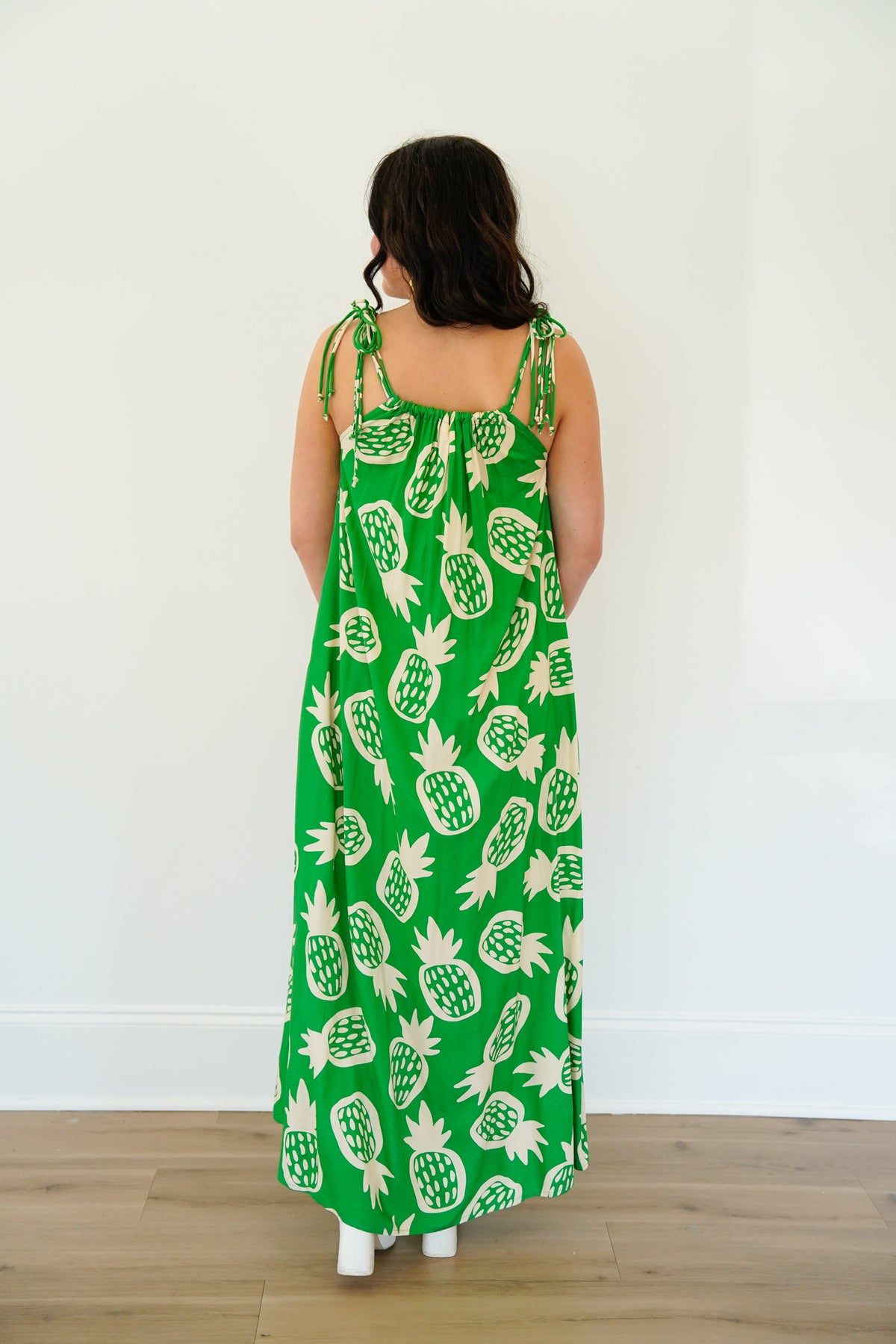 Get ready for your next summer party with this flowy maxi dress featuring a fun pineapple print and adjustable ties at the shoulders. With the added convenience of pockets, you'll look and feel effortlessly stylish and comfortable all day long. Don't miss out on this must-have dress!