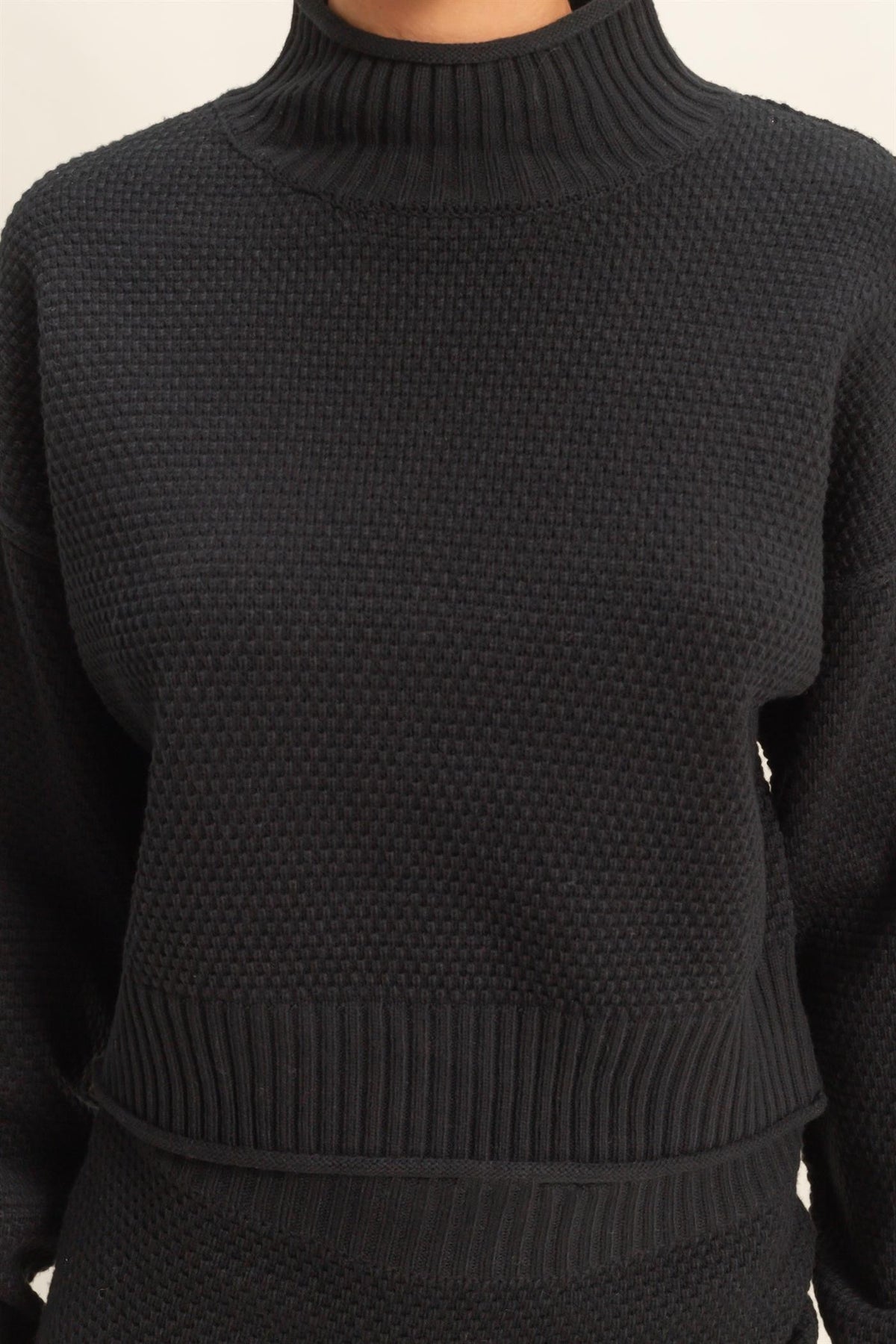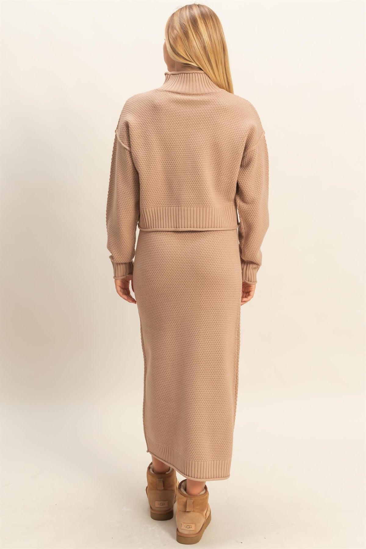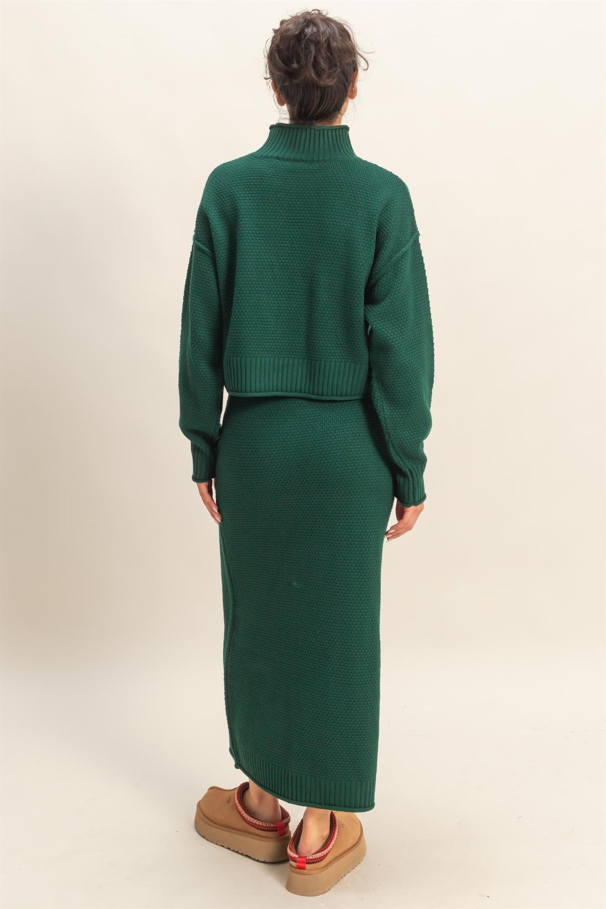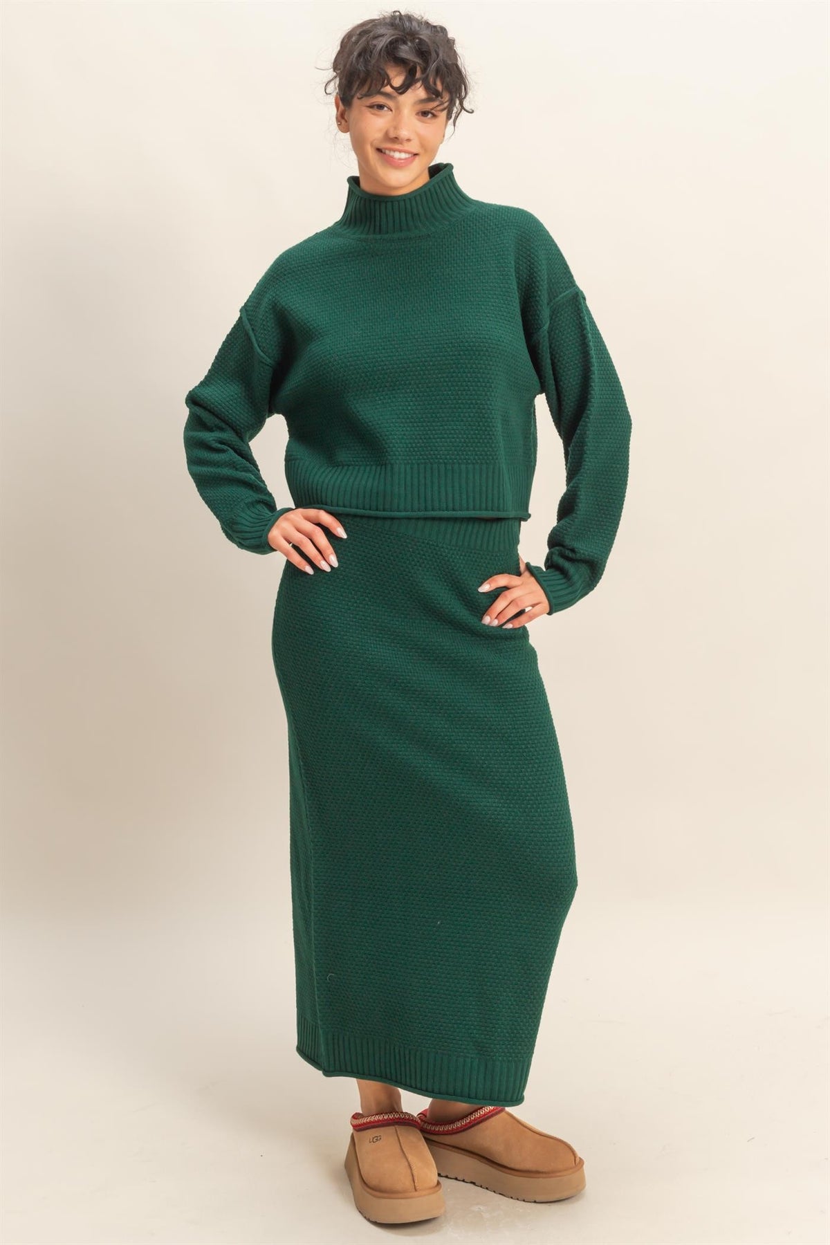 a high neckline, drop shoulders, and a relaxed fit. The coordinating midi