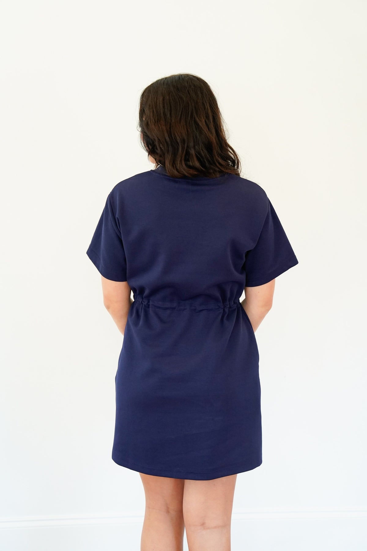 Enhance your wardrobe with our stunning mini dress, complete with a solid round neck and adjustable drawstring waist. Perfect for any occasion, this dress features pockets at the sides and is crafted from lightweight knitted fabric, adding a touch of elegance to your ensemble. Stay comfortable and stylish without sacrificing quality with our non-sheer, unlined design.