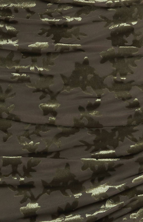 This burnout velvet midi dress showcases a sleek tubular neckline, long sleeves, and elegant side shirring, complemented by a convenient back zipper closure for a perfect fit.