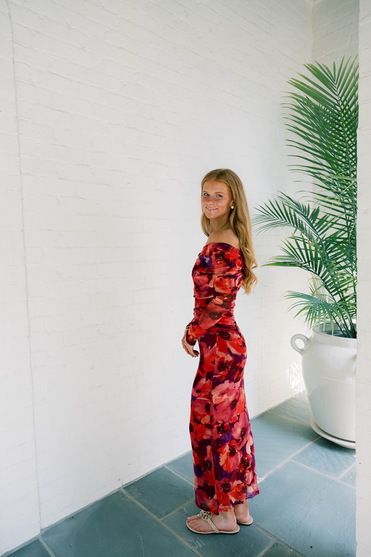 off-the-shoulder neckline. The model, standing at 5'9", wears a size Small.