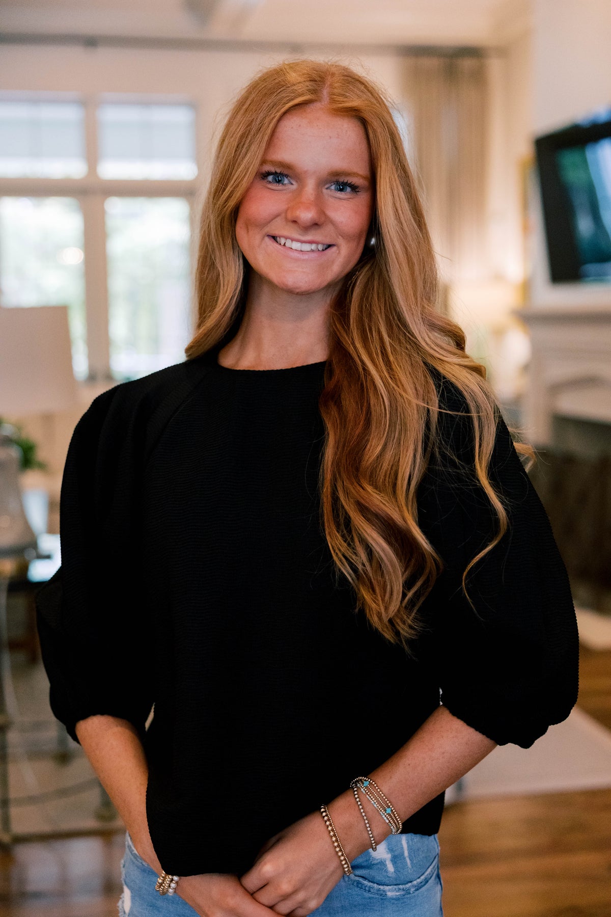 This blouse features a round neckline and voluminous paneled 3/4 sleeves, making it an essential versatile piece perfect for any season.