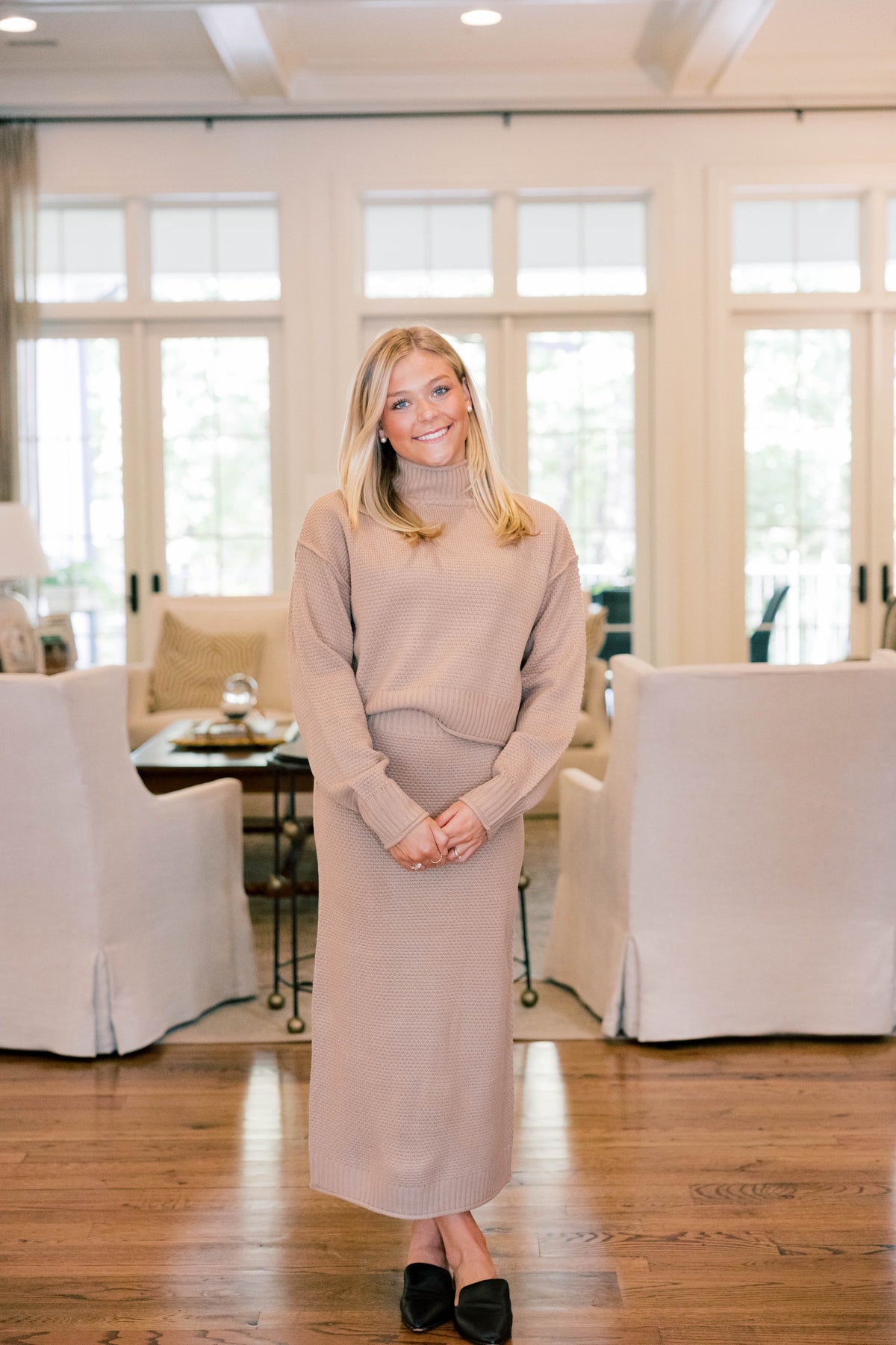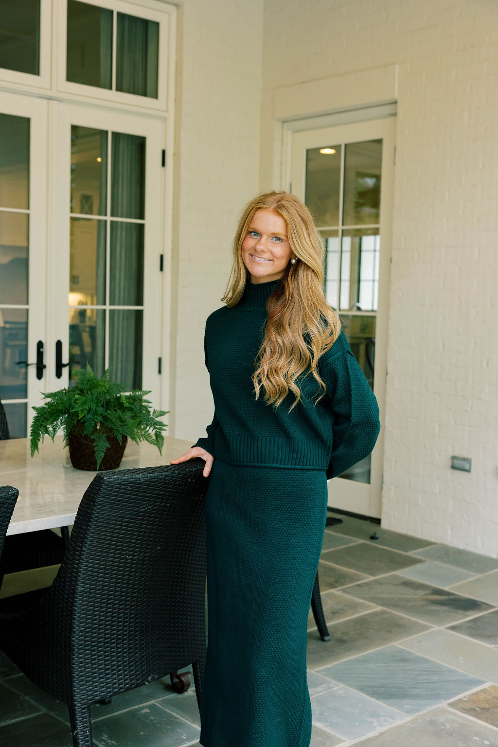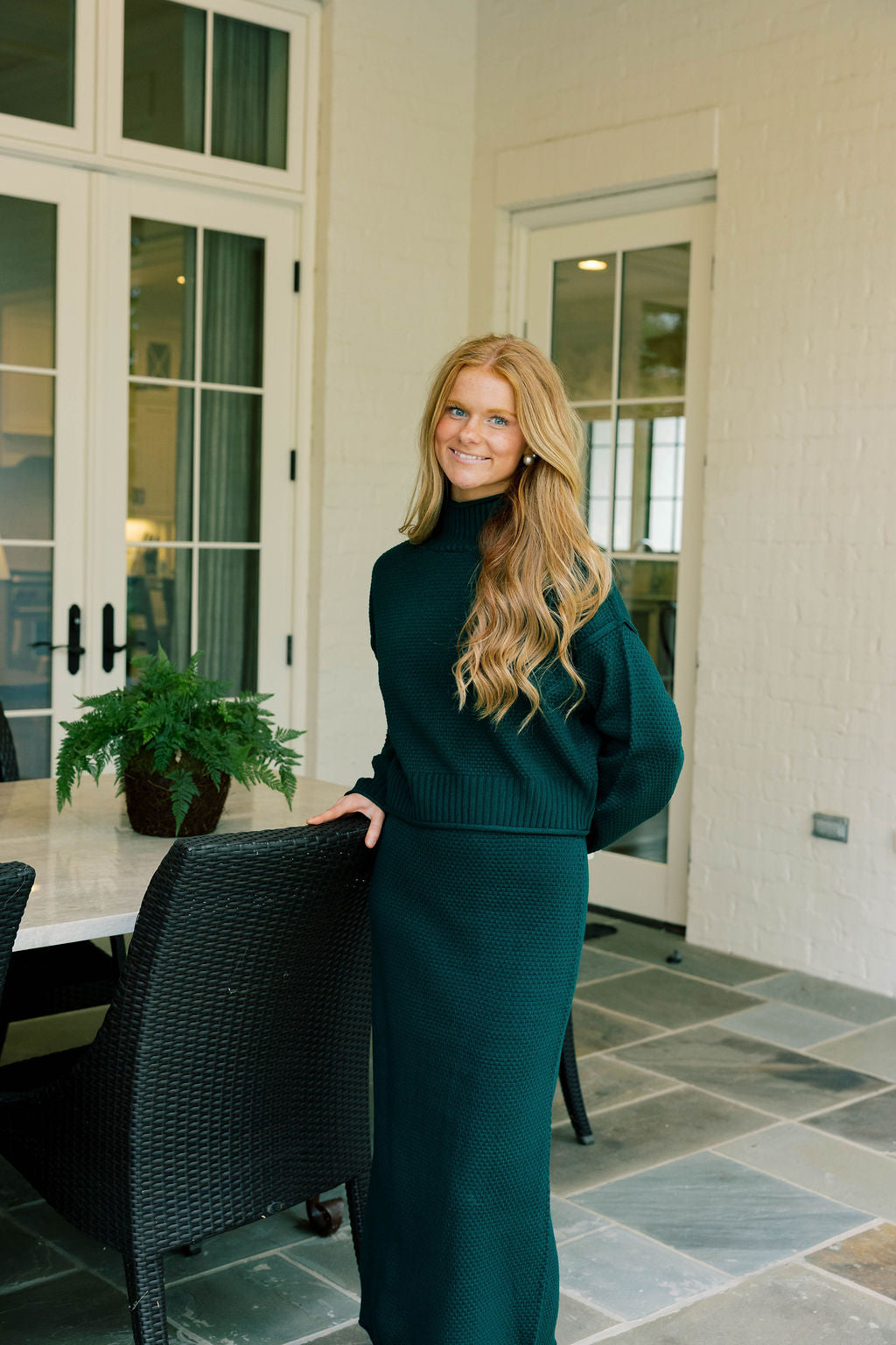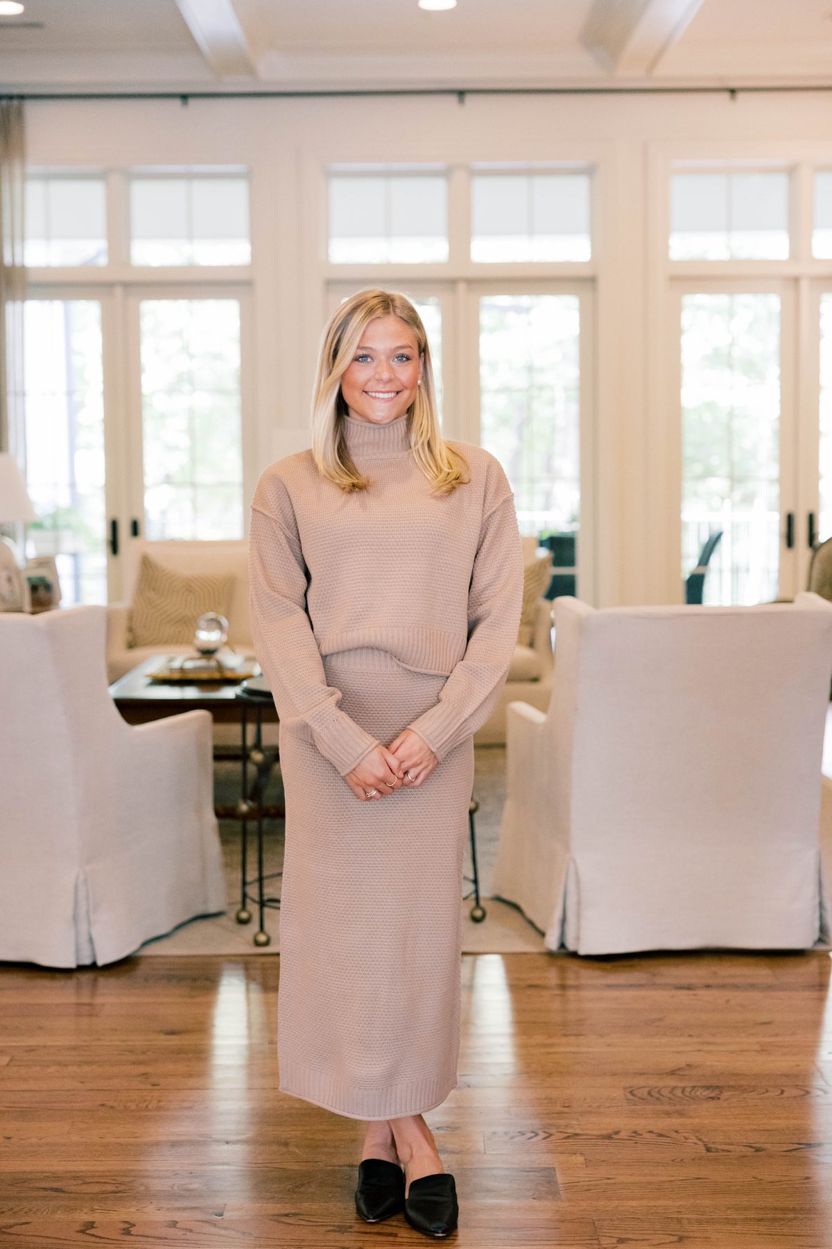 a high neckline, drop shoulders, and a relaxed fit. The coordinating midi