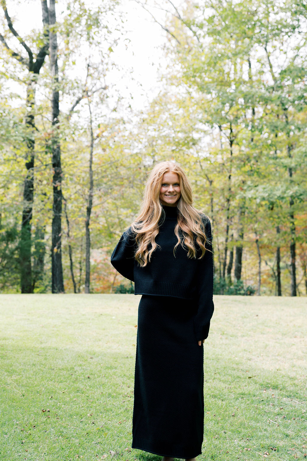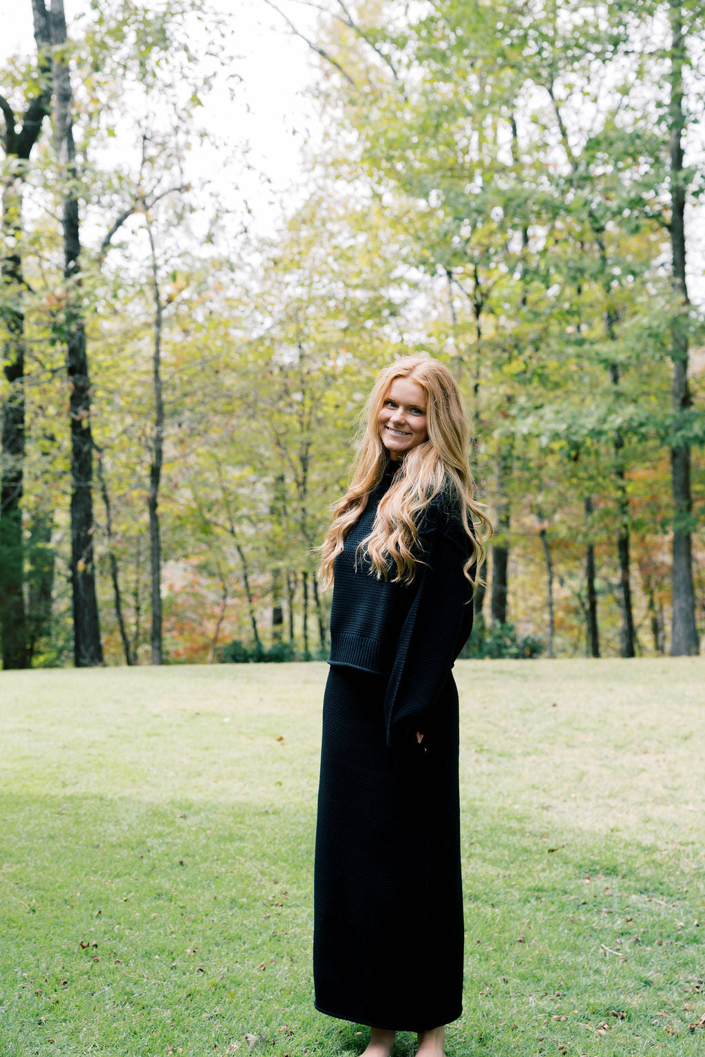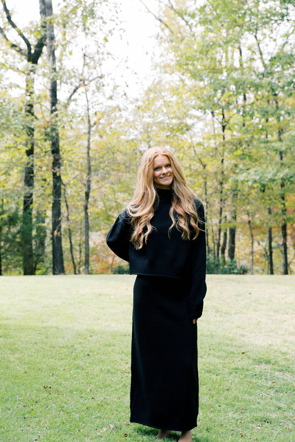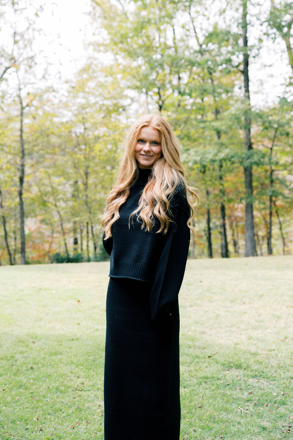 a high neckline, drop shoulders, and a relaxed fit. The coordinating midi