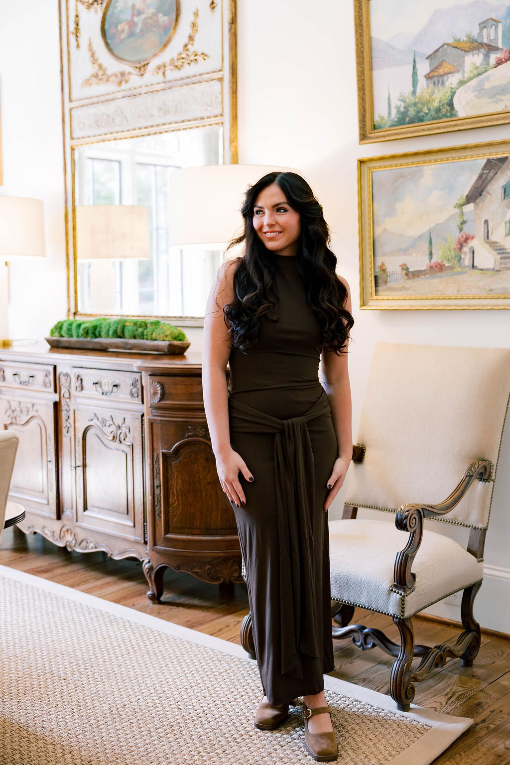 Sharp lines, soft movement. The Victoria Dress features a sleeveless, figure-skimming silhouette with a high mock neckline and subtle ruching at the back waist to shape the fit. A front tie detail drapes from the waist for added dimension, balanced by an ankle-length hem that elongates the look. Sleek, minimal, and made for moments that call for a little structure.