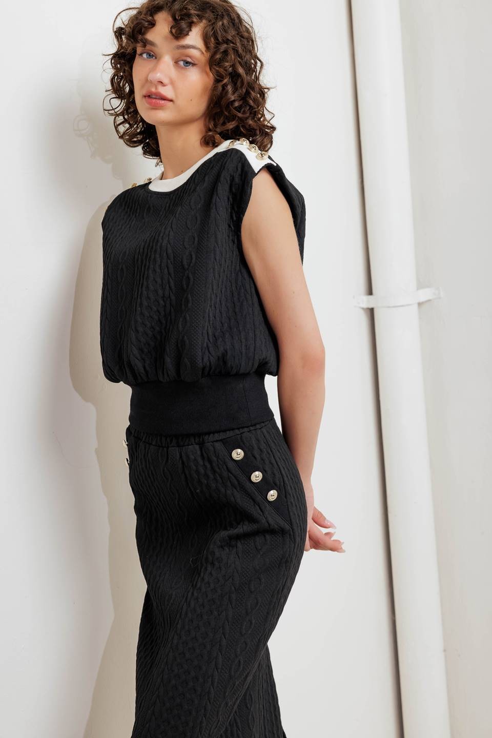and stylish side buttons. The matching knit top offers a round neckline, a