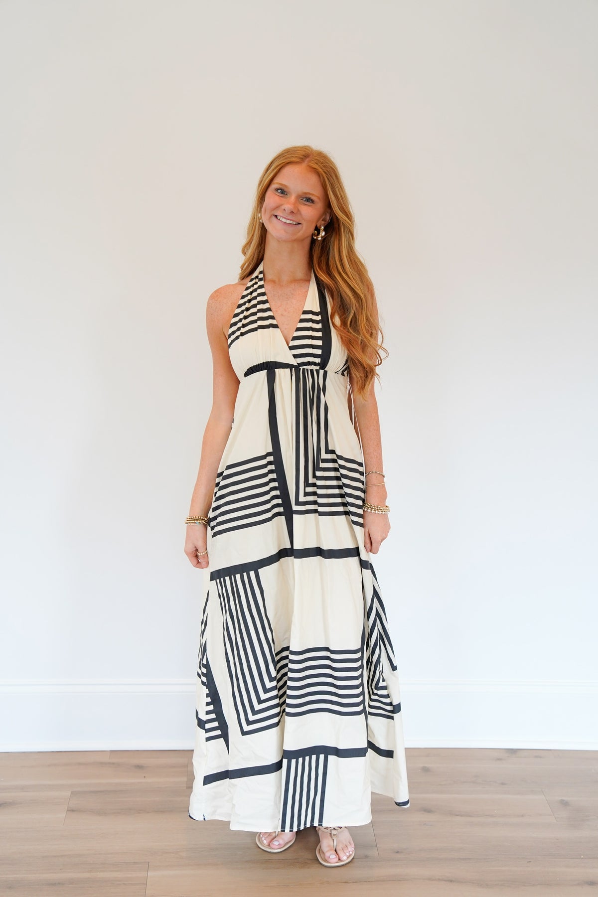 This playful maxi dress features a vibrant multi-geo print and a halter neckline with adjustable ties for a perfect fit. Made from 100% cotton, it offers comfort and style all day long.