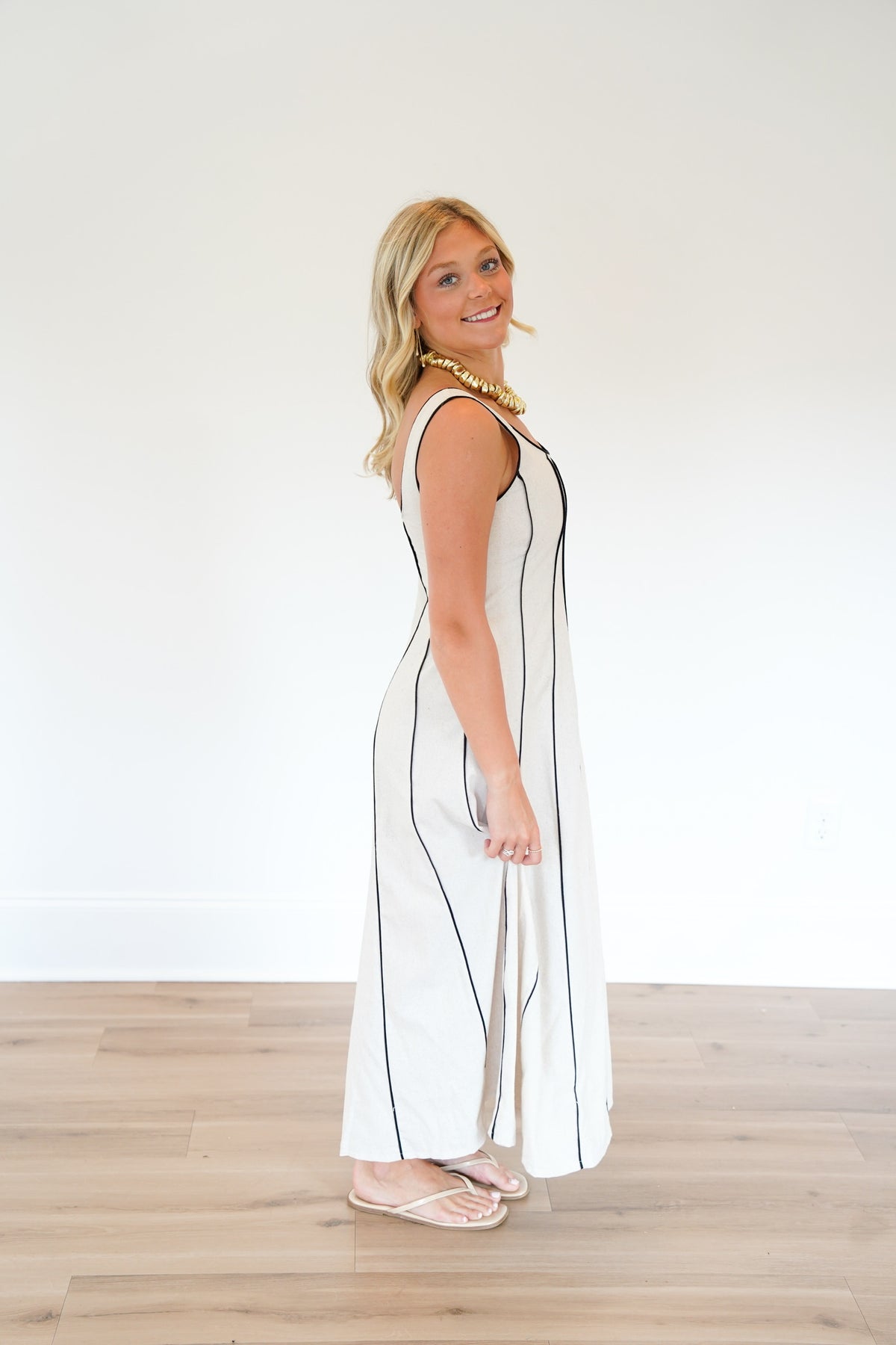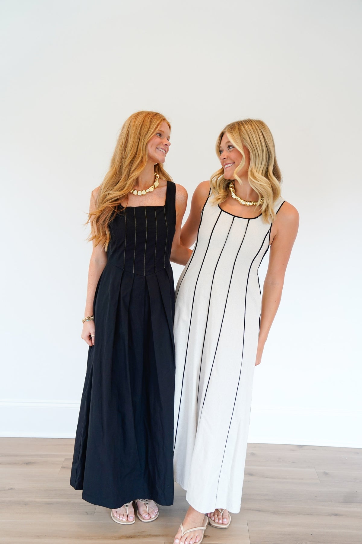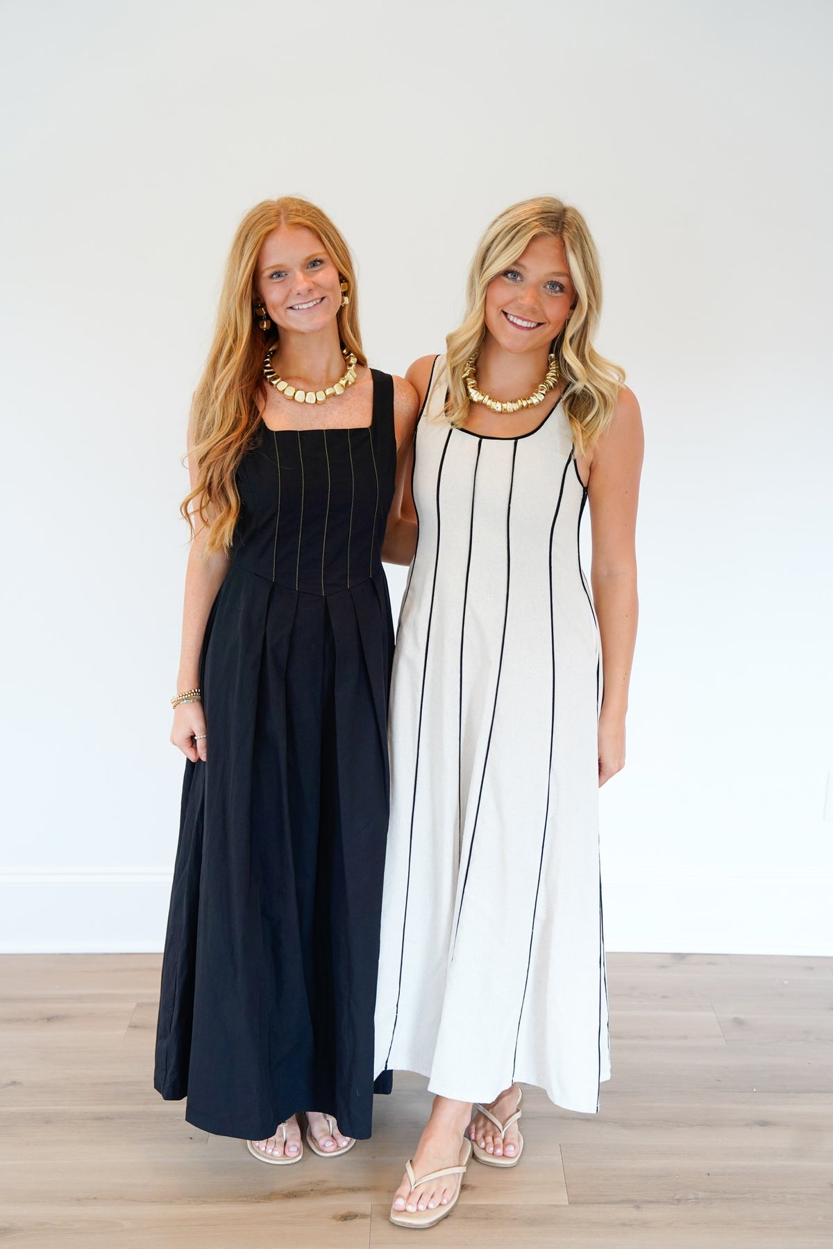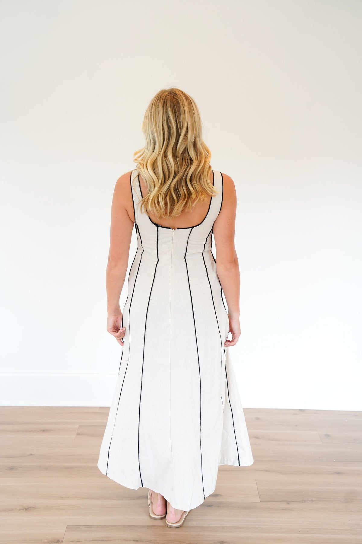 This fun long dress features piping details and a square neckline, with a convenient zip-up back for easy wear.