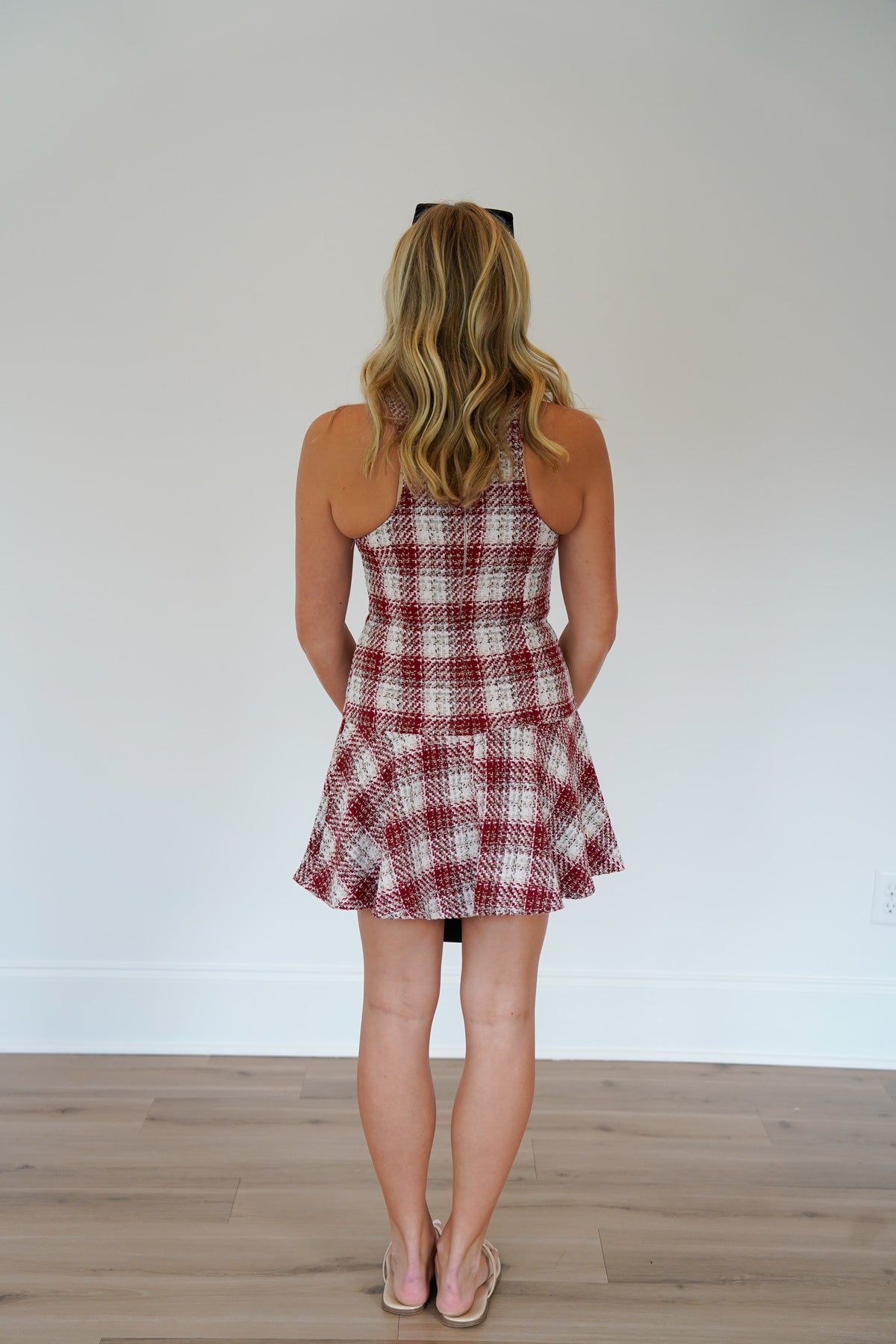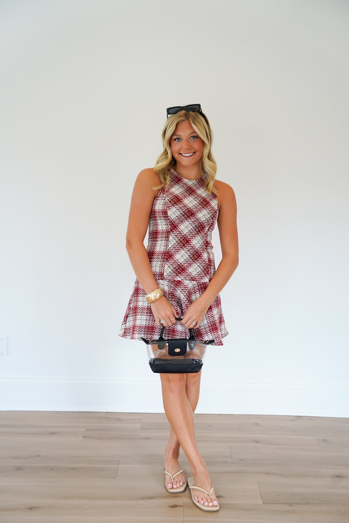 This tweed night neck flare dress is an ideal choice for fall and Alabama gameday, combining style and seasonal charm effortlessly.