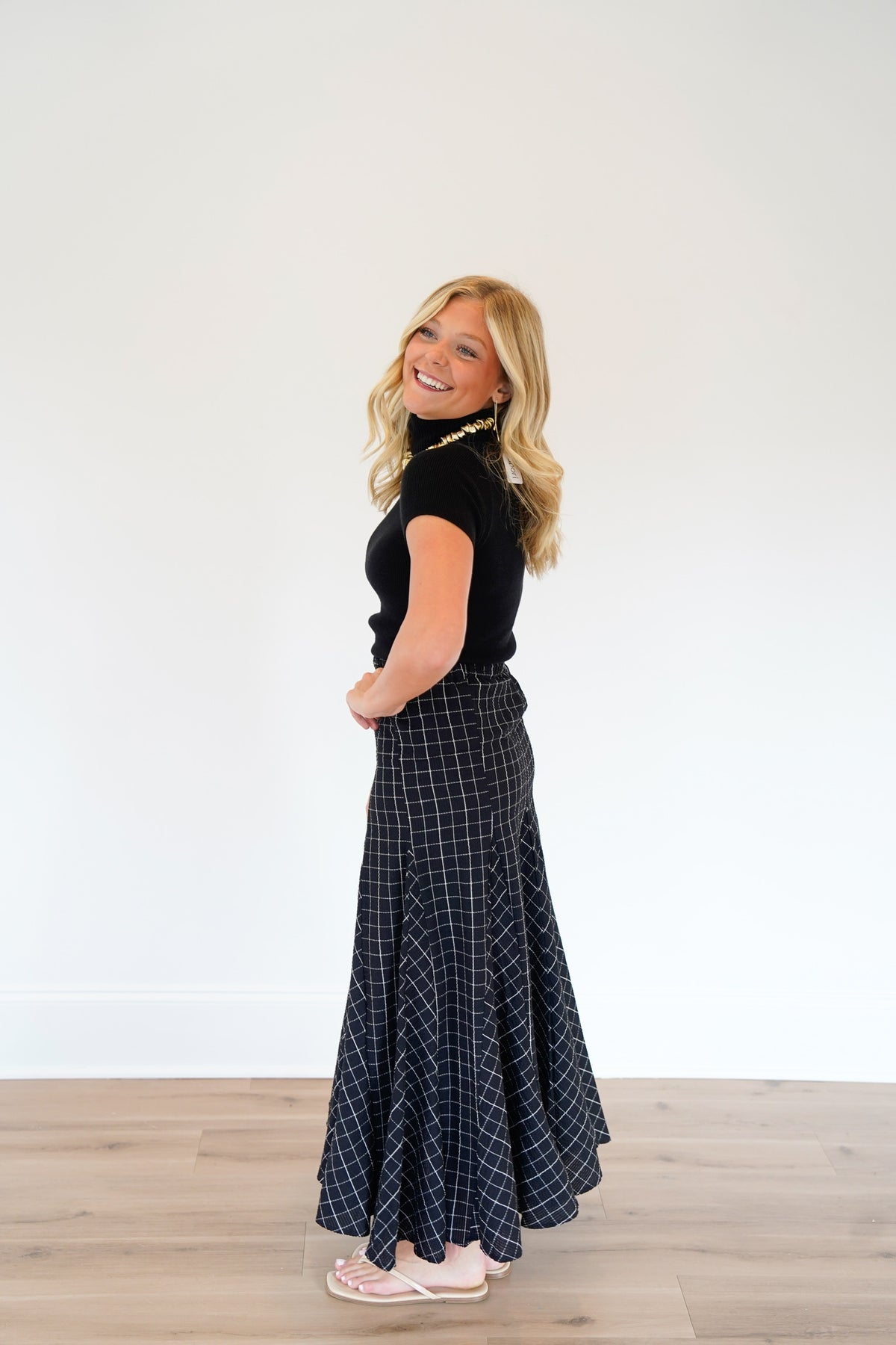 The Sallie Checkered Maxi Skirt showcases a flattering banded waistband
