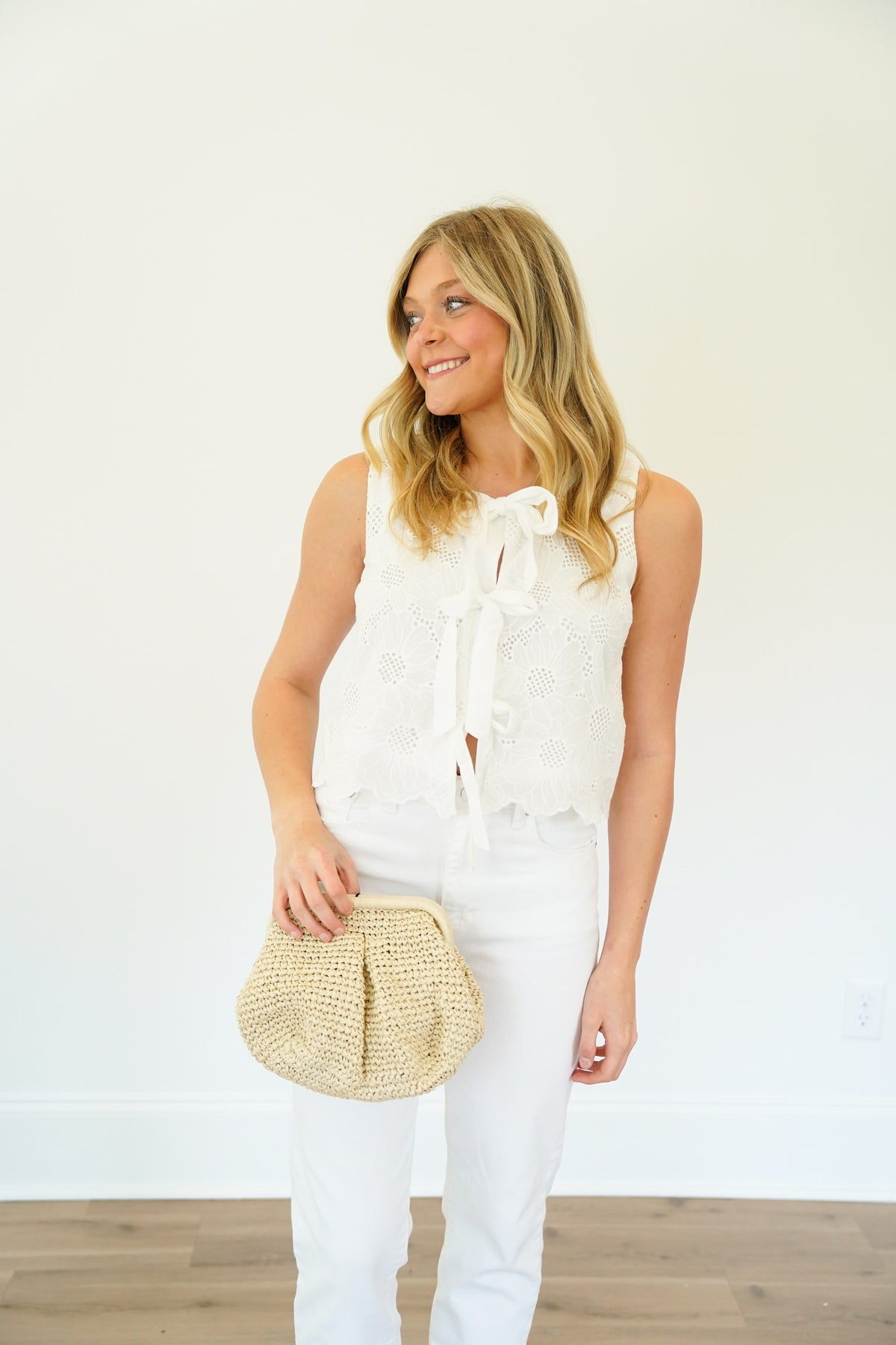 Get ready for some flower power with this playful sleeveless top! It features a dainty eyelet design and a cute bow tie closure. Perfect for a sunny day, this top is lightweight, unlined, and non-sheer for maximum comfort. Plus, the scalloped hem adds an extra touch of whimsy.
