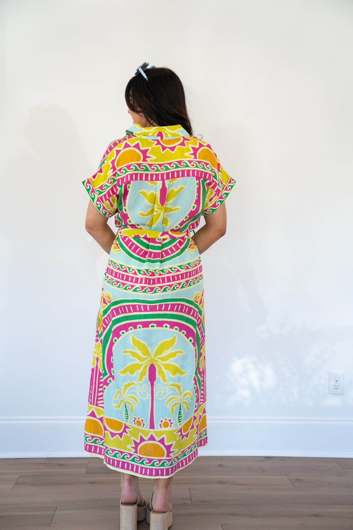 Effortlessly transition from beach to brunch in this lightweight shirt dress, featuring a vibrant tropical print and short sleeves designed for warm-weather comfort. The coordinating belt with raffia buckle adds a polished finishing touch, making it an essential piece for your summer wardrobe.