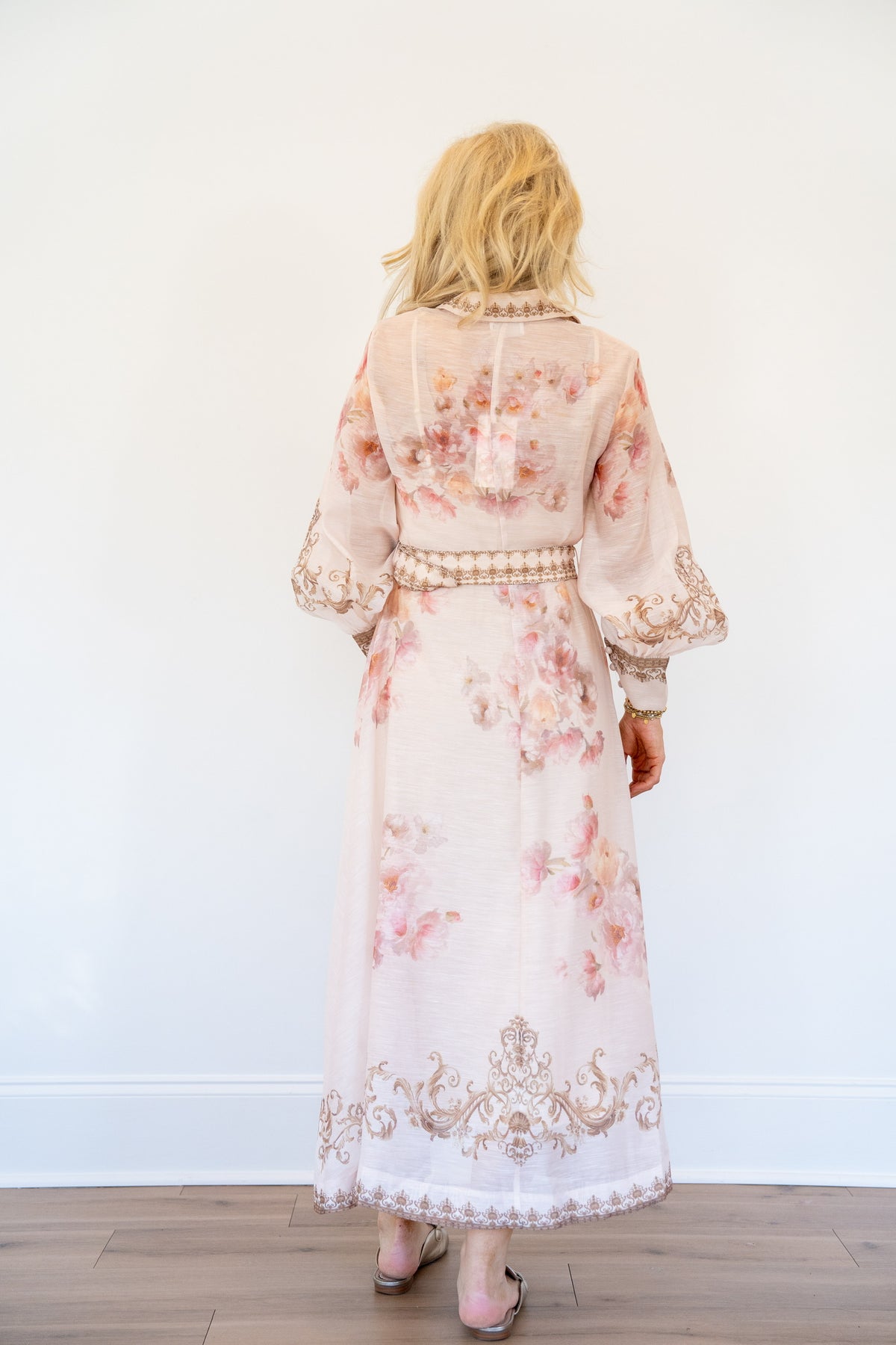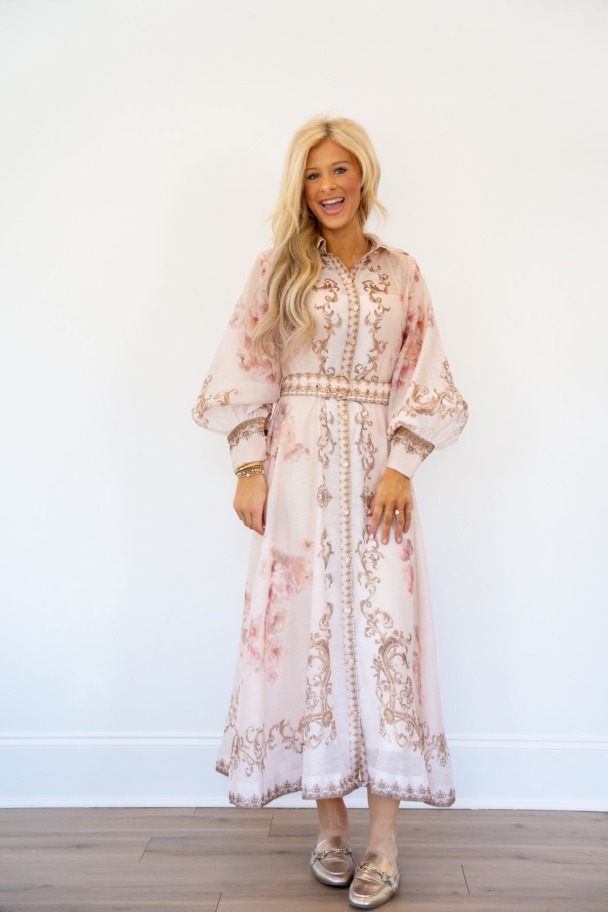 Elegant dress drawing inspiration from high-end design, featuring exquisite craftsmanship and a refined floral palette. The soft, luxurious fabric drapes beautifully while the intricate pattern details elevate any occasion with understated sophistication.