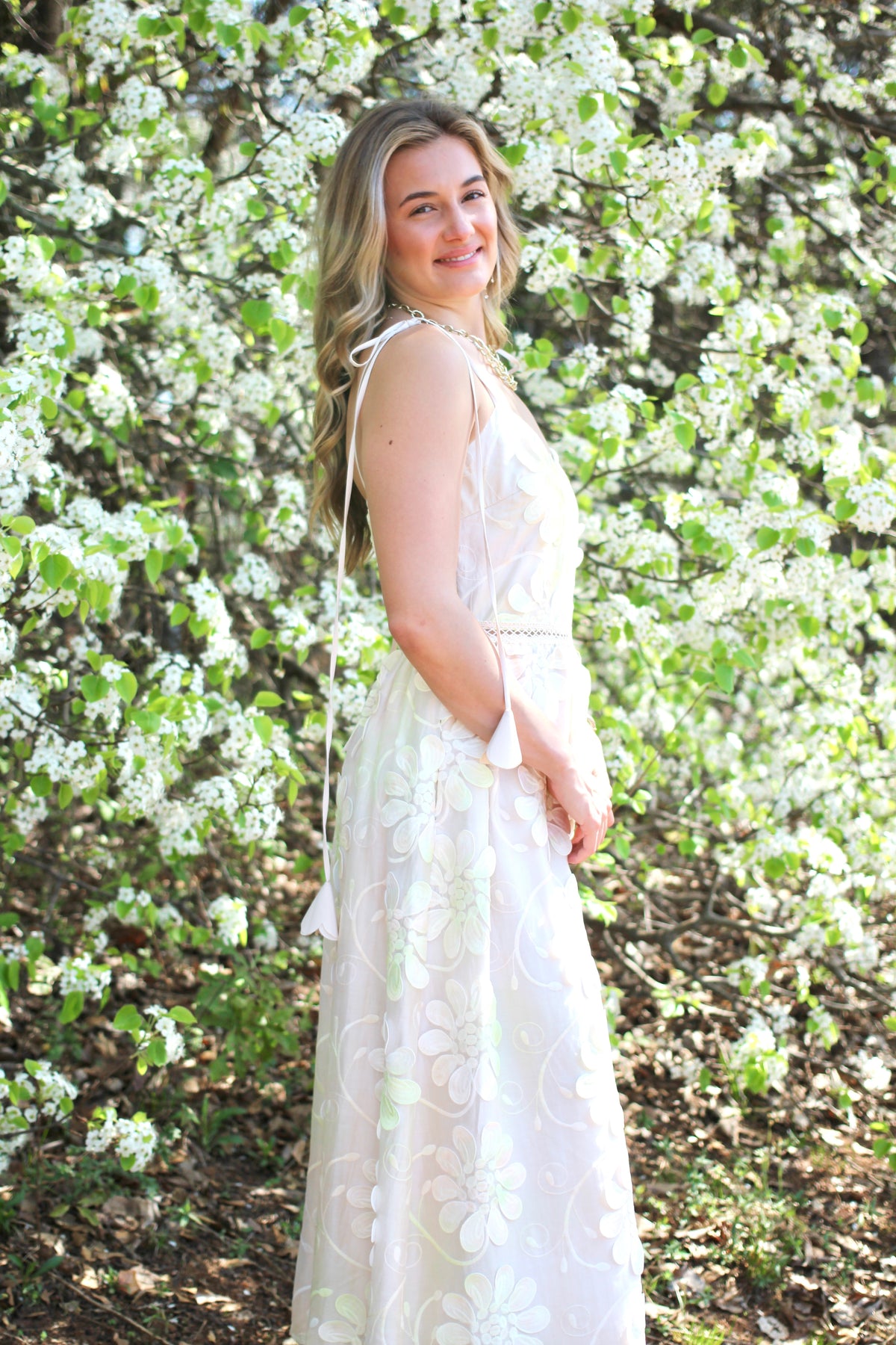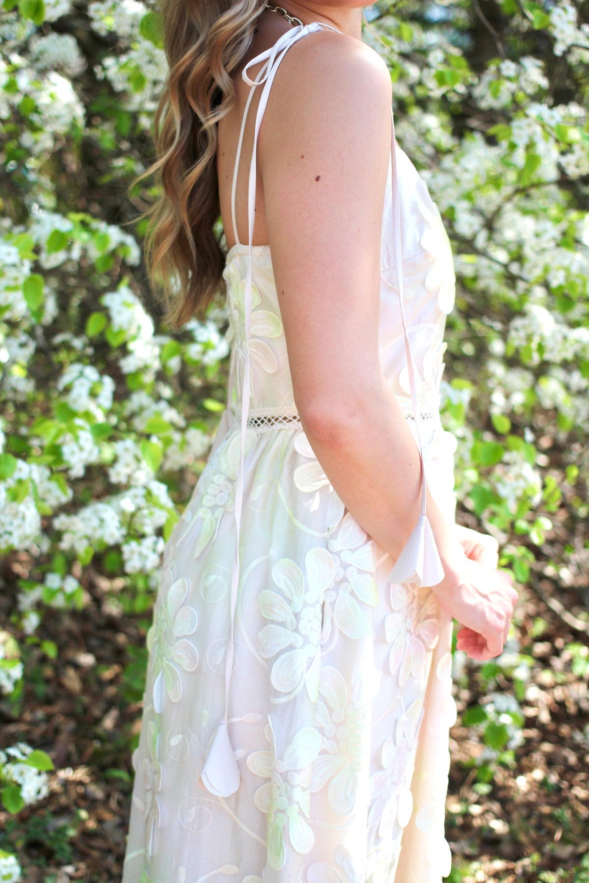 This elegant midi dress features adjustable shoulder ties and a rear zip closure for effortless styling. Intricate three-dimensional floral embellishments cascade throughout the garment, creating a sophisticated botanical aesthetic. The thoughtfully designed silhouette balances statement details with wearable elegance, making it an ideal choice for elevated occasions.