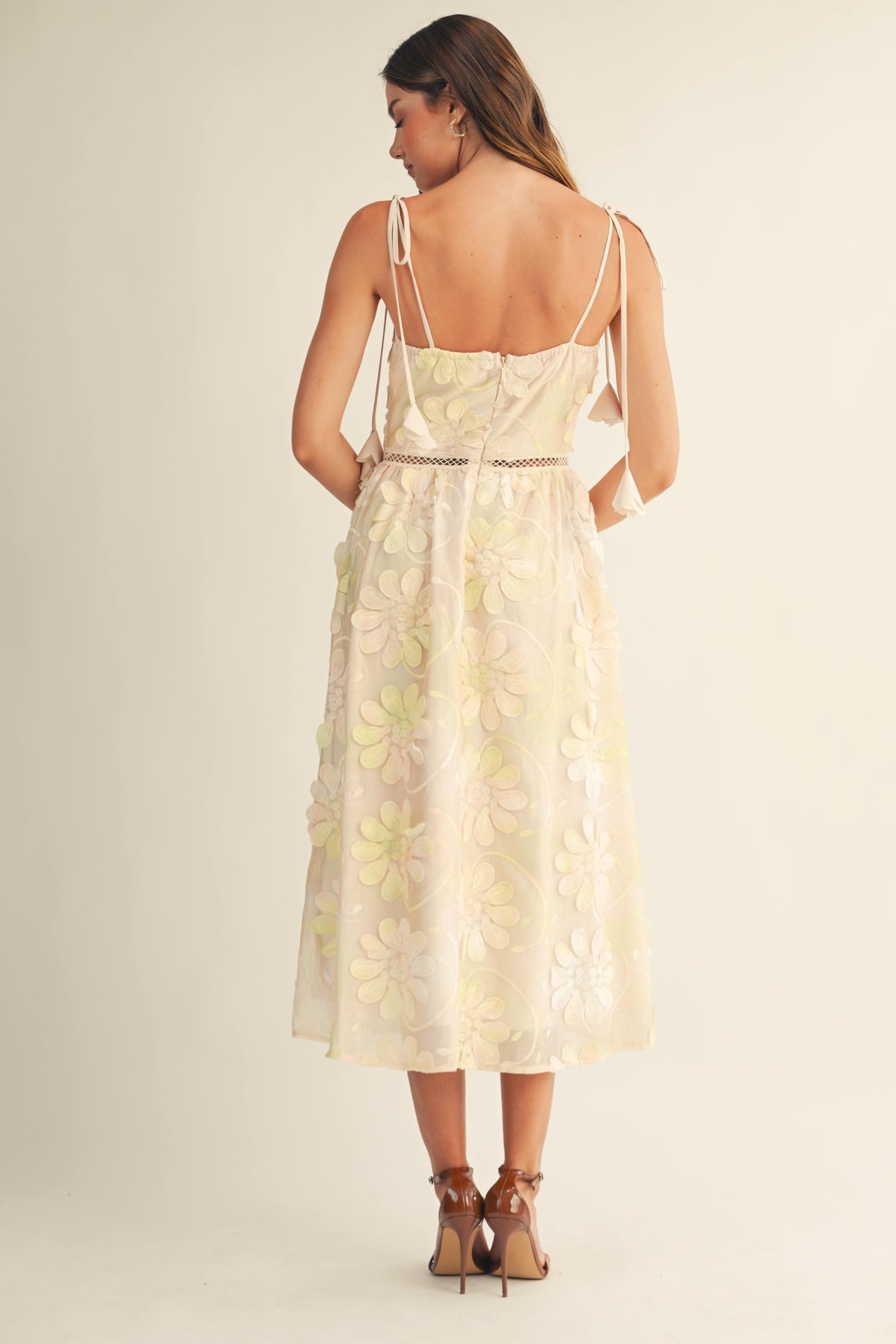This elegant midi dress features adjustable shoulder ties and a rear zip closure for effortless styling. Intricate three-dimensional floral embellishments cascade throughout the garment, creating a sophisticated botanical aesthetic. The thoughtfully designed silhouette balances statement details with wearable elegance, making it an ideal choice for elevated occasions.
