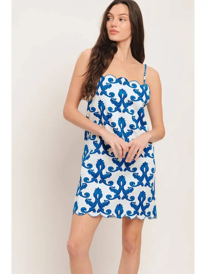 Effortlessly chic, this printed woven mini dress combines timeless elegance with modern details. The straight neckline and delicate straps create a flattering silhouette, while the charming scallop edge adds a refined finishing touch. A discreet back zipper ensures a smooth fit every time. Perfect for elevating your everyday style or making an impression at any occasion.