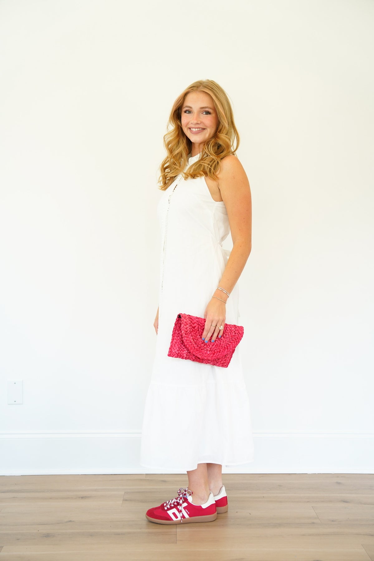 The Adelaide Dress is a playful maxi that turns heads with its sleeveless halter neck and chic button-up front. Featuring a flattering collared design and a tie waist, it effortlessly highlights your silhouette while keeping things fun and flirty. Perfect for sunny days and stylish nights!