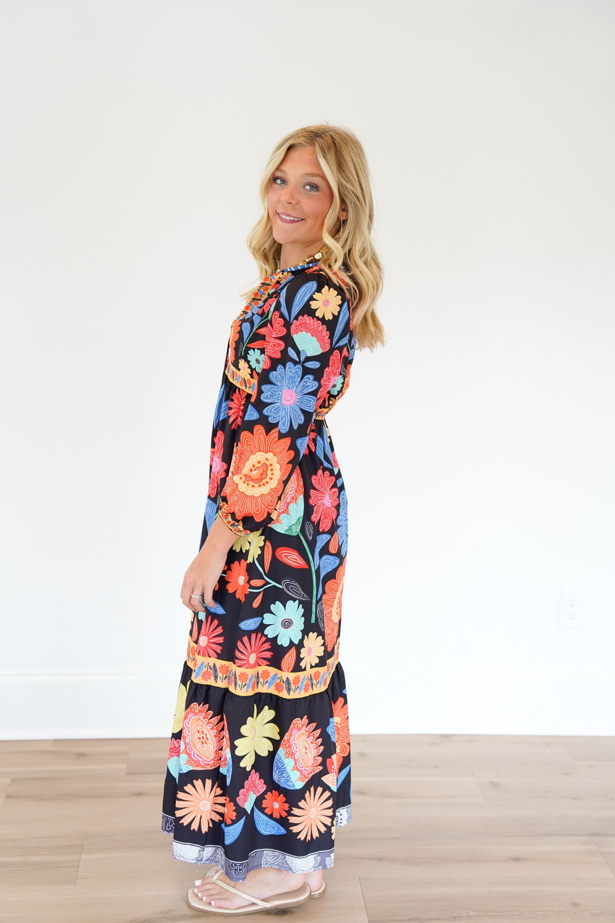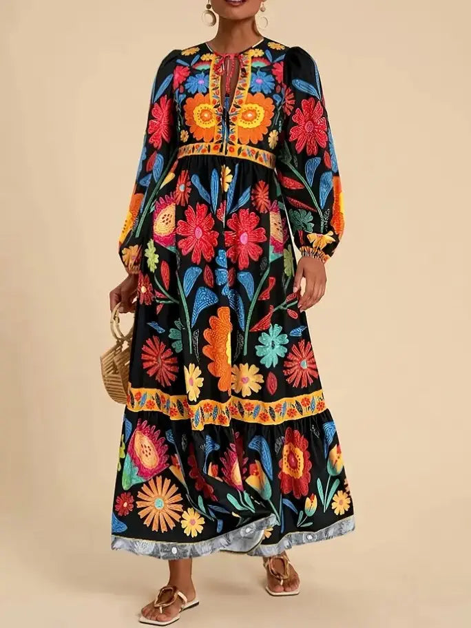 Embrace the lively spirit of the tropics with this colorful Bohemian-inspired long sleeve dress, featuring a stunning floral pattern that brings a fresh, vibrant look to your wardrobe.