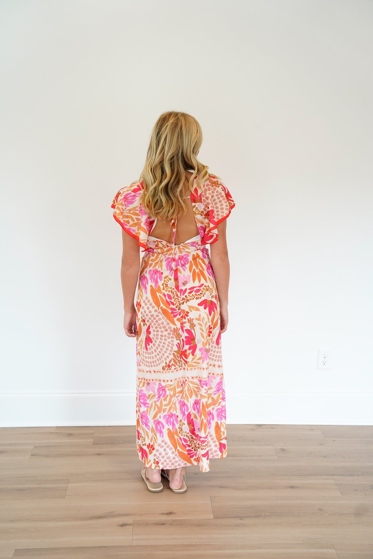 Elevate your look with this chic backless dress featuring a ruffled split design and a bold positional print that commands attention.