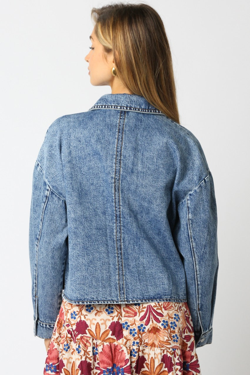 This Kali Denim Jacket offers a relaxed silhouette complemented by stylish pocket accents. Crafted with woven fabric for durability and comfort.