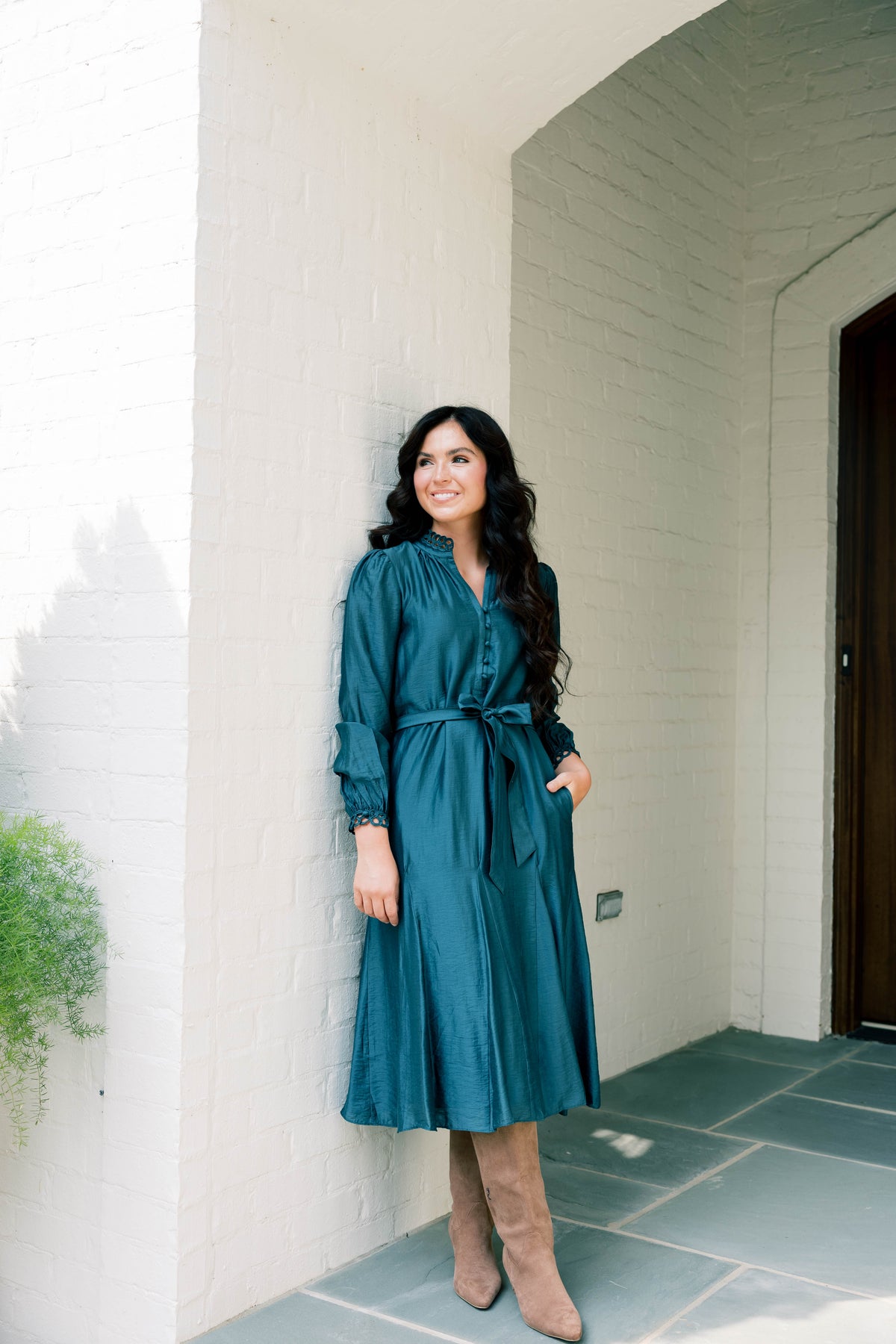 This stunning midi dress features a long sleeve design with an elegant split neckline, adding a captivating touch to your look. Its beautiful neck detail enhances sophistication, making it perfect for any stylish occasion.