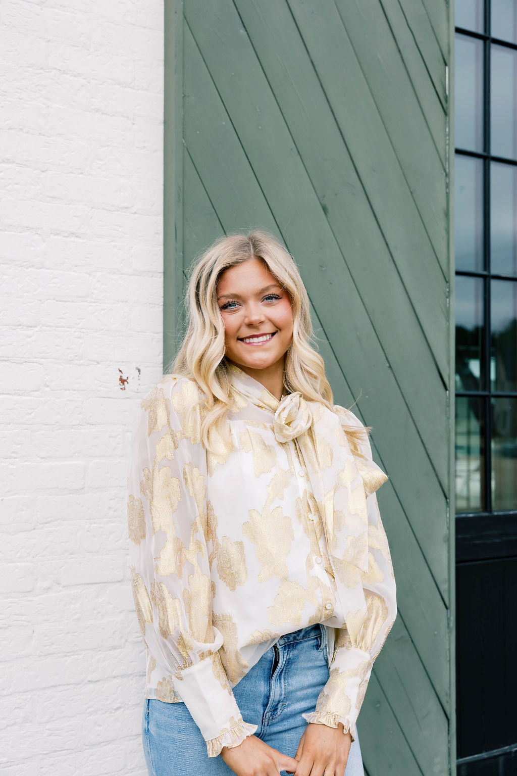 Elevate your style with this shimmering jacquard chiffon blouse, featuring an elegant bow detail for a touch of sophistication. MODEL HEIGHT: 5' 8"
