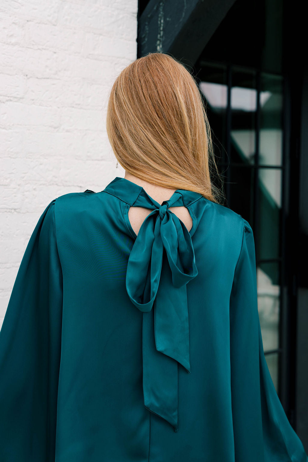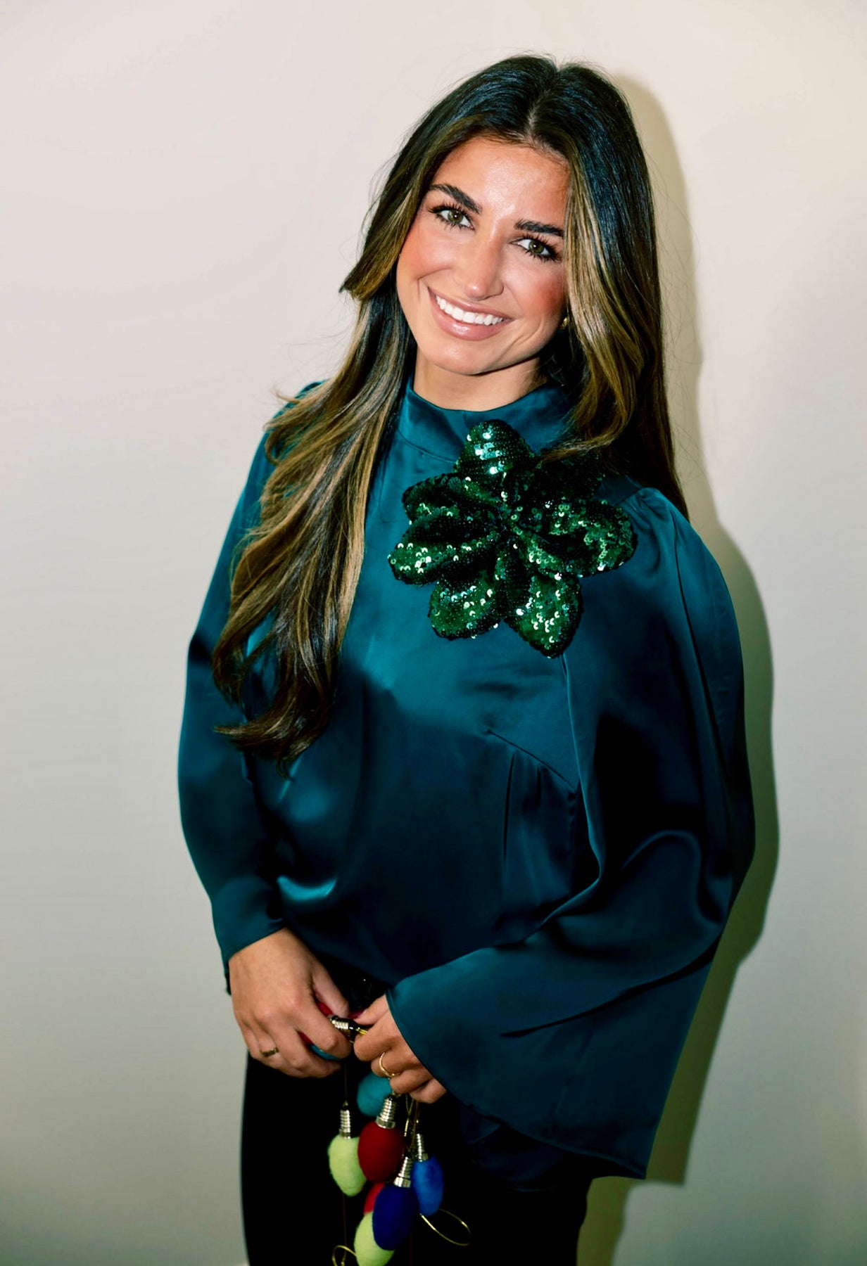 Elevate your festive wardrobe with this stunning satin holiday top, featuring an eye-catching emerald green sequin flower embellishment at the shoulder. Whether you're attending an elegant holiday party or a Christmas service, this piece delivers sophisticated style with just the right amount of sparkle. Designed to fit true to size, it's the effortless choice for creating a memorable, polished look this season.