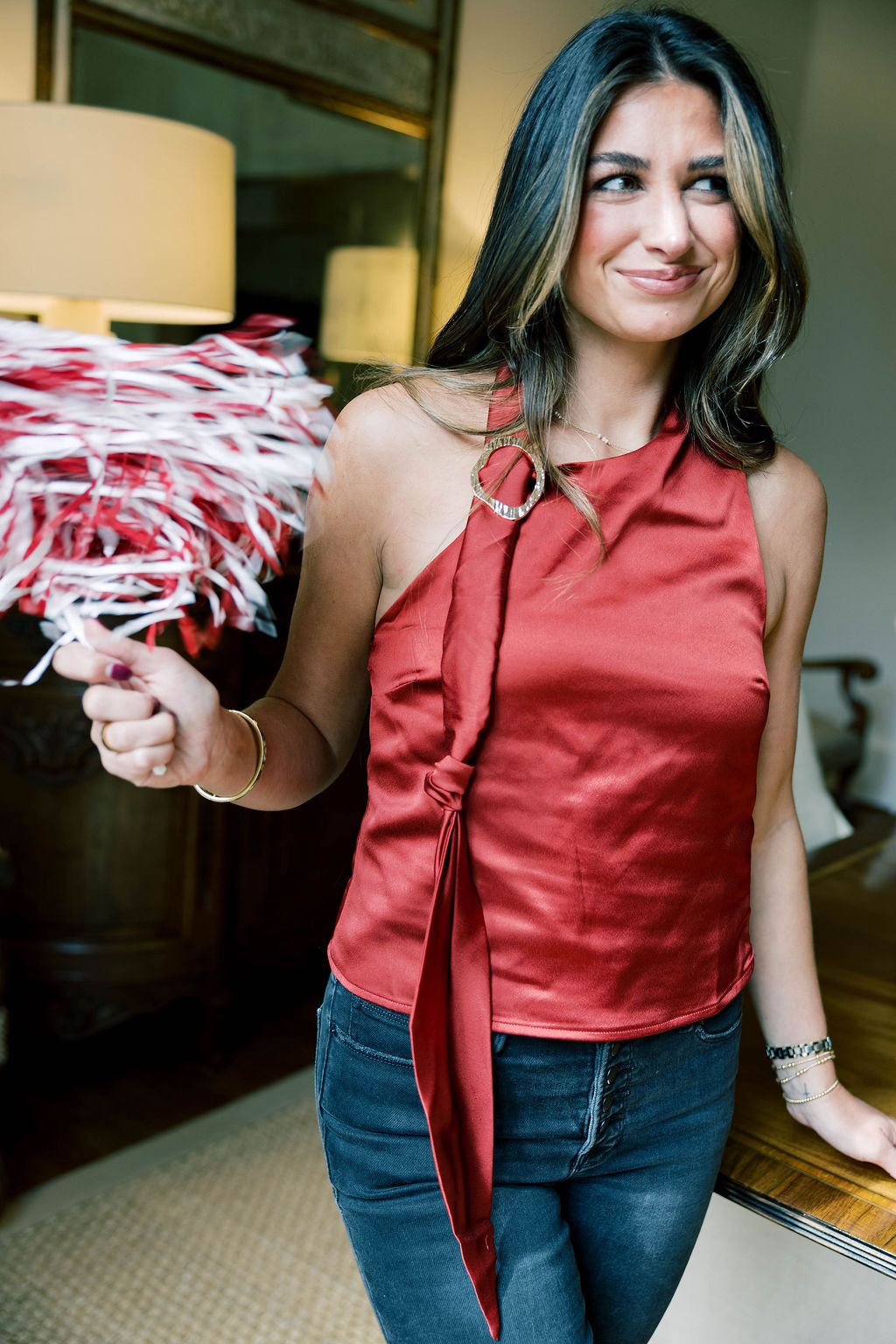 This satin halter top features an asymmetrical design with a chic one-shoulder cut and stylish scarf detail, perfect for making a bold fashion statement.