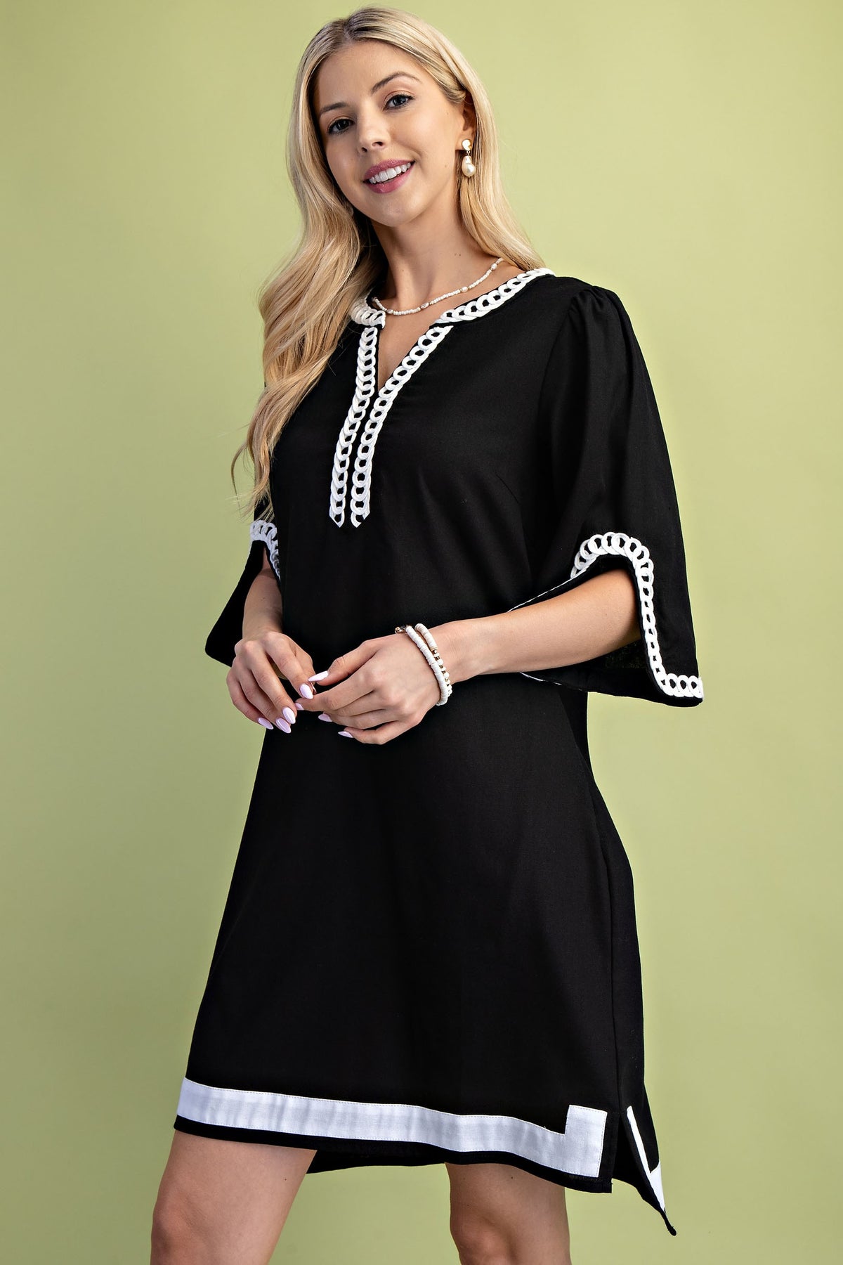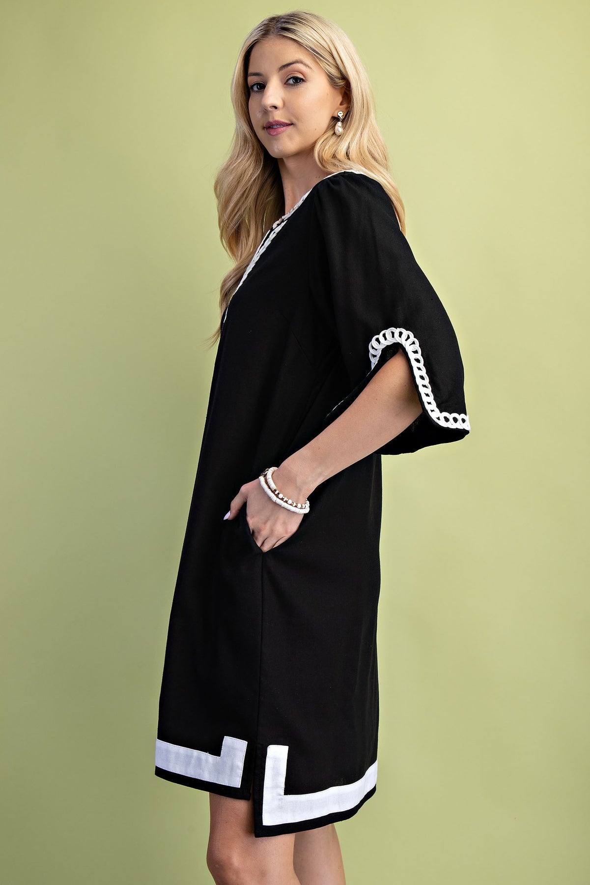 This 3/4 sleeve linen dress features a stylish notch neckline and delicate embroidered accents, offering a perfect blend of comfort and elegance. Model is 5'7" wearing a small.