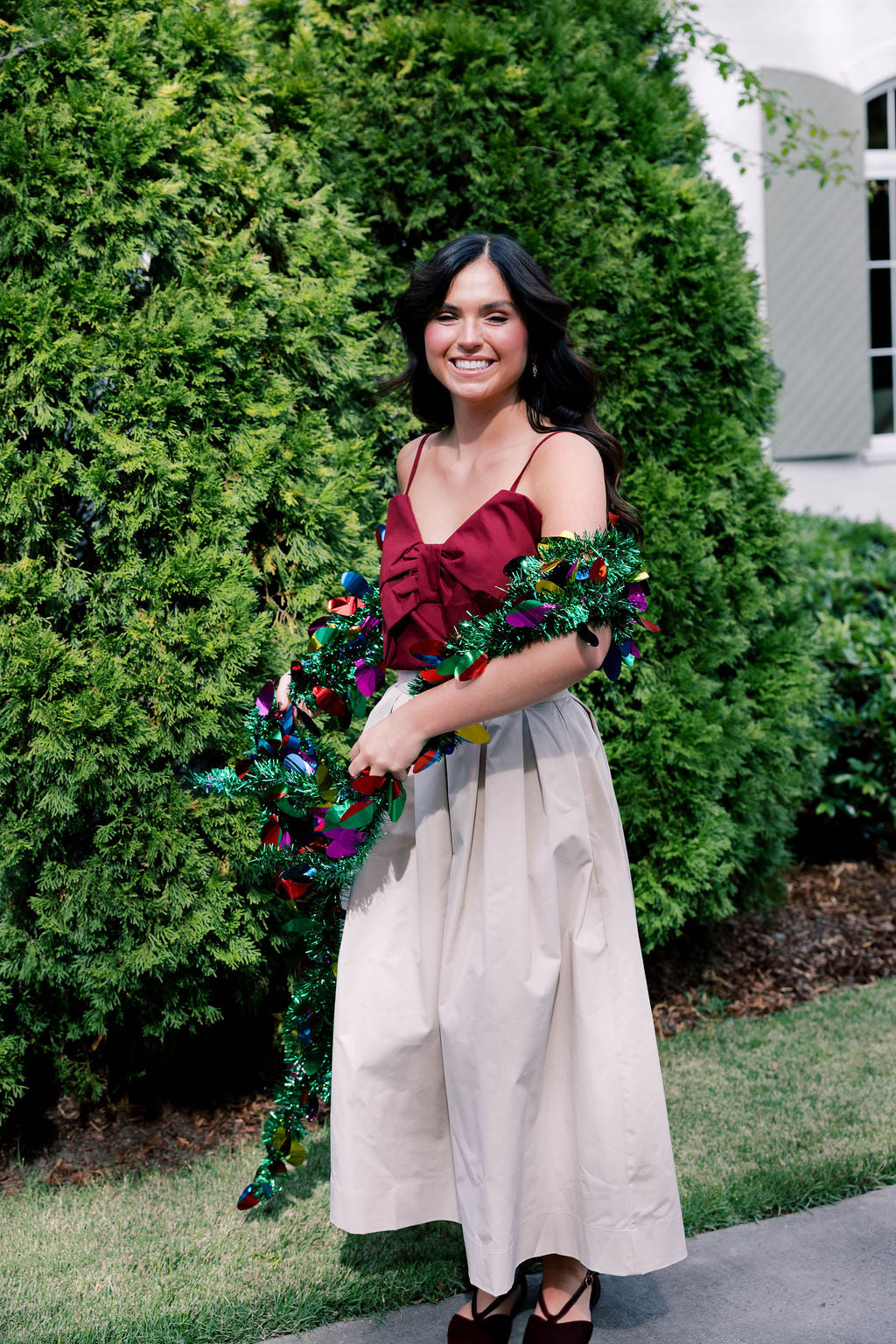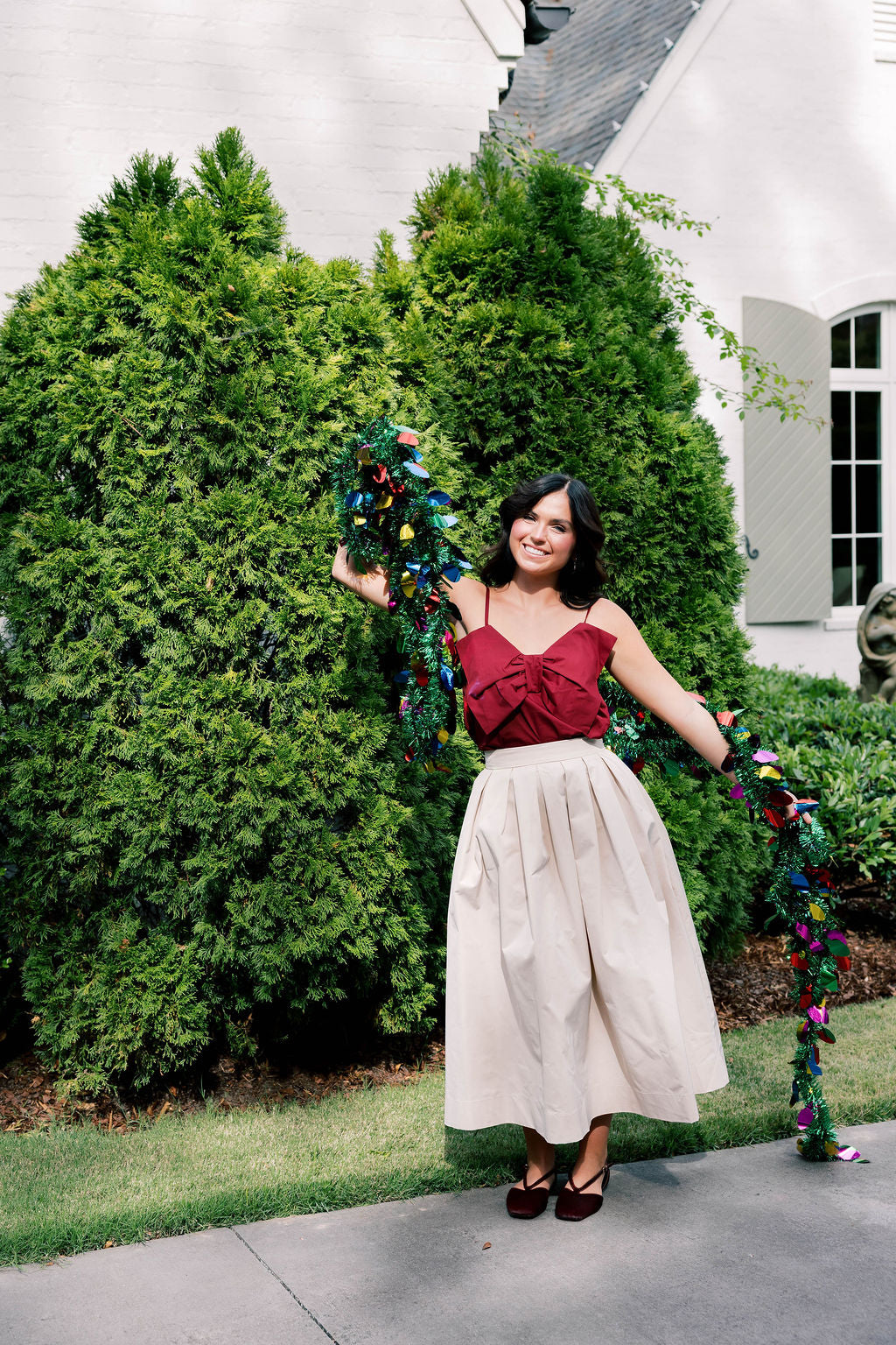 Show your spirit in this burgundy poplin top featuring a stylish bow at the bust. With adjustable straps and a stretchy back, it offers a comfortable, customized fit—ideal for cheering on Alabama game day in style.