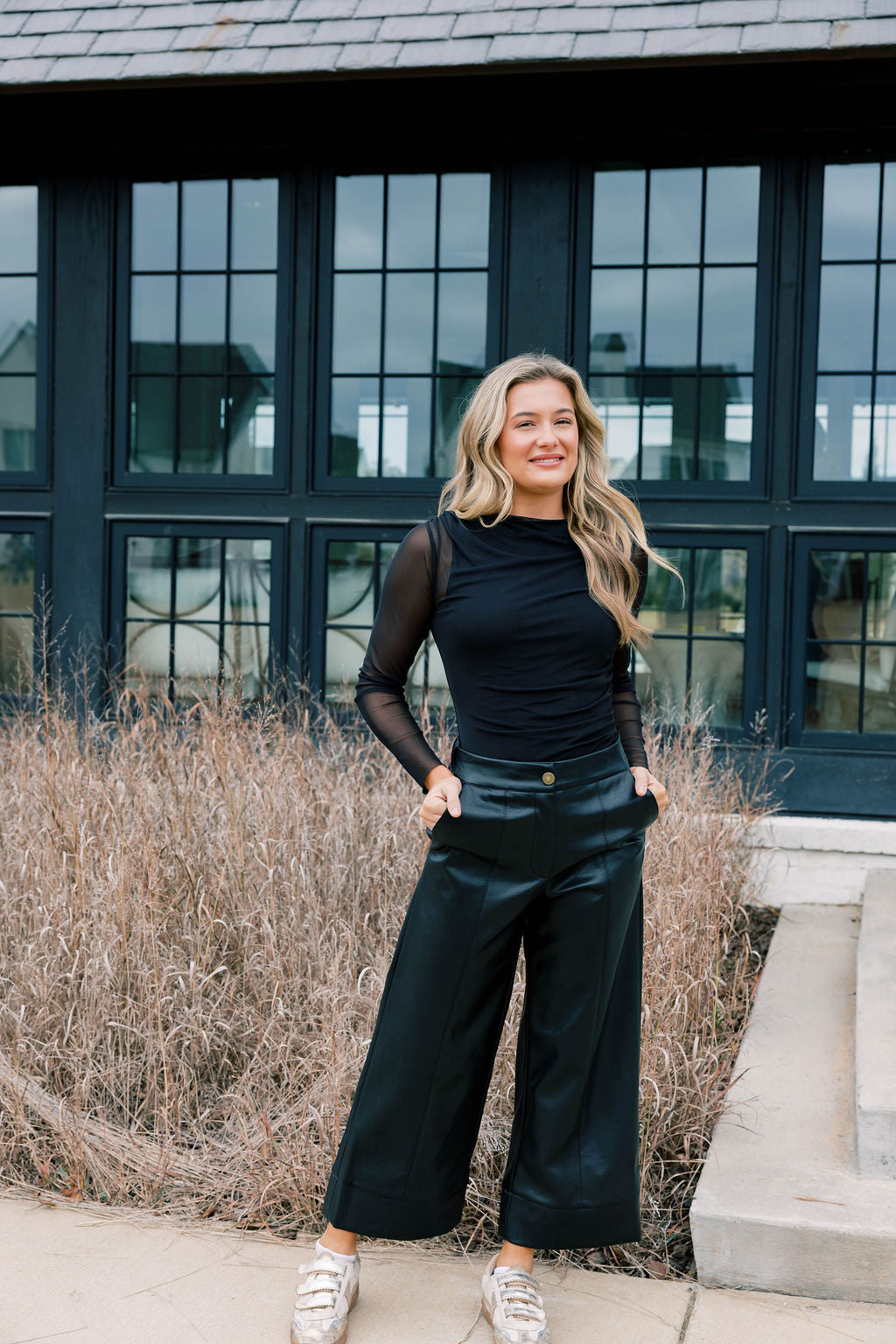 neckline flatters your frame while sheer mesh panels introduce contemporary