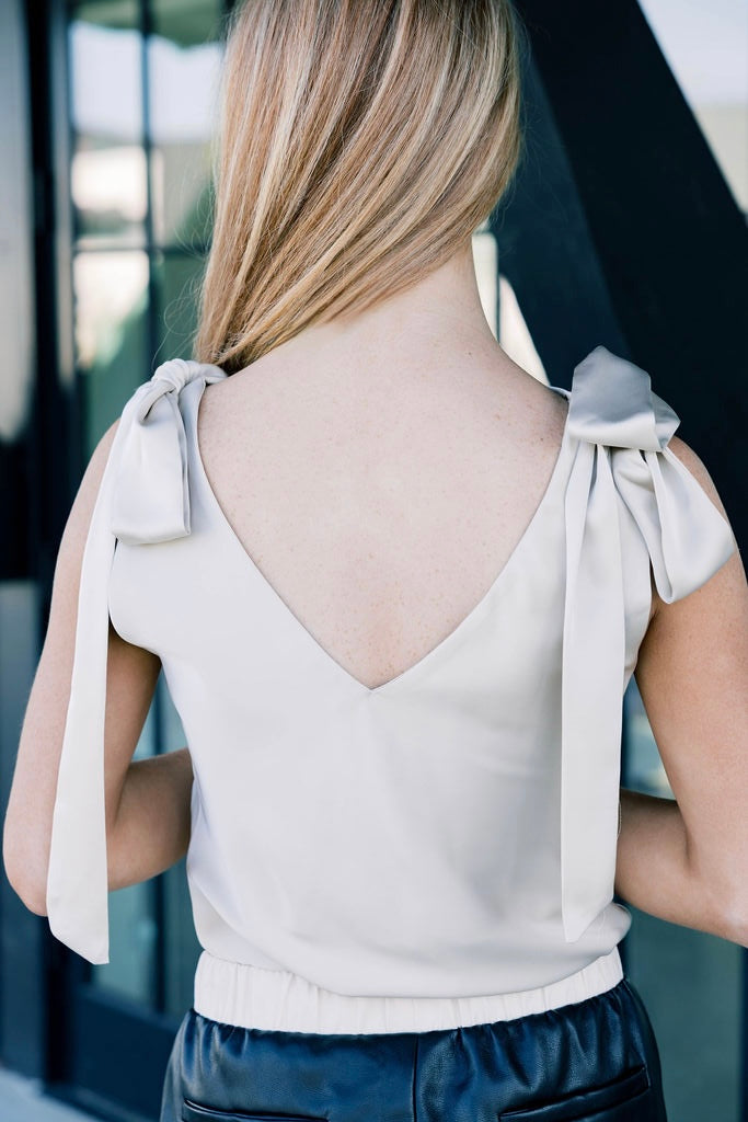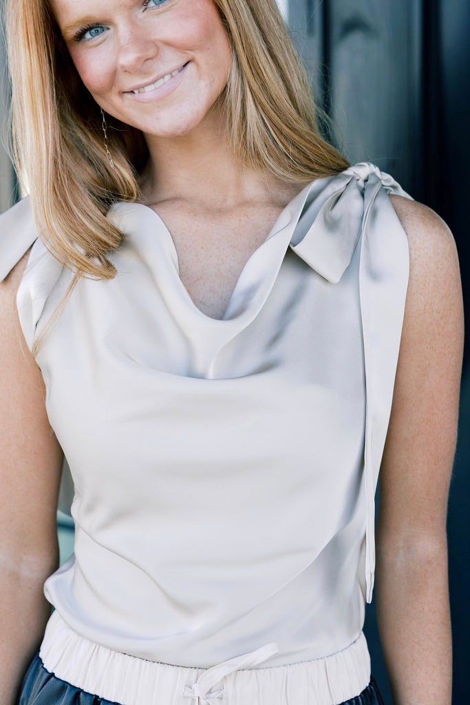 Elevate any occasion with this luxurious champagne silk satin blouse, featuring charming bow ties at the shoulders. Whether you're heading to a formal event or keeping it casual, this versatile piece effortlessly transitions from day to night. The soft, lustrous fabric drapes beautifully while the distinctive shoulder bows add an elegant touch of sophistication. Perfect for creating polished looks that feel both refined and approachable.