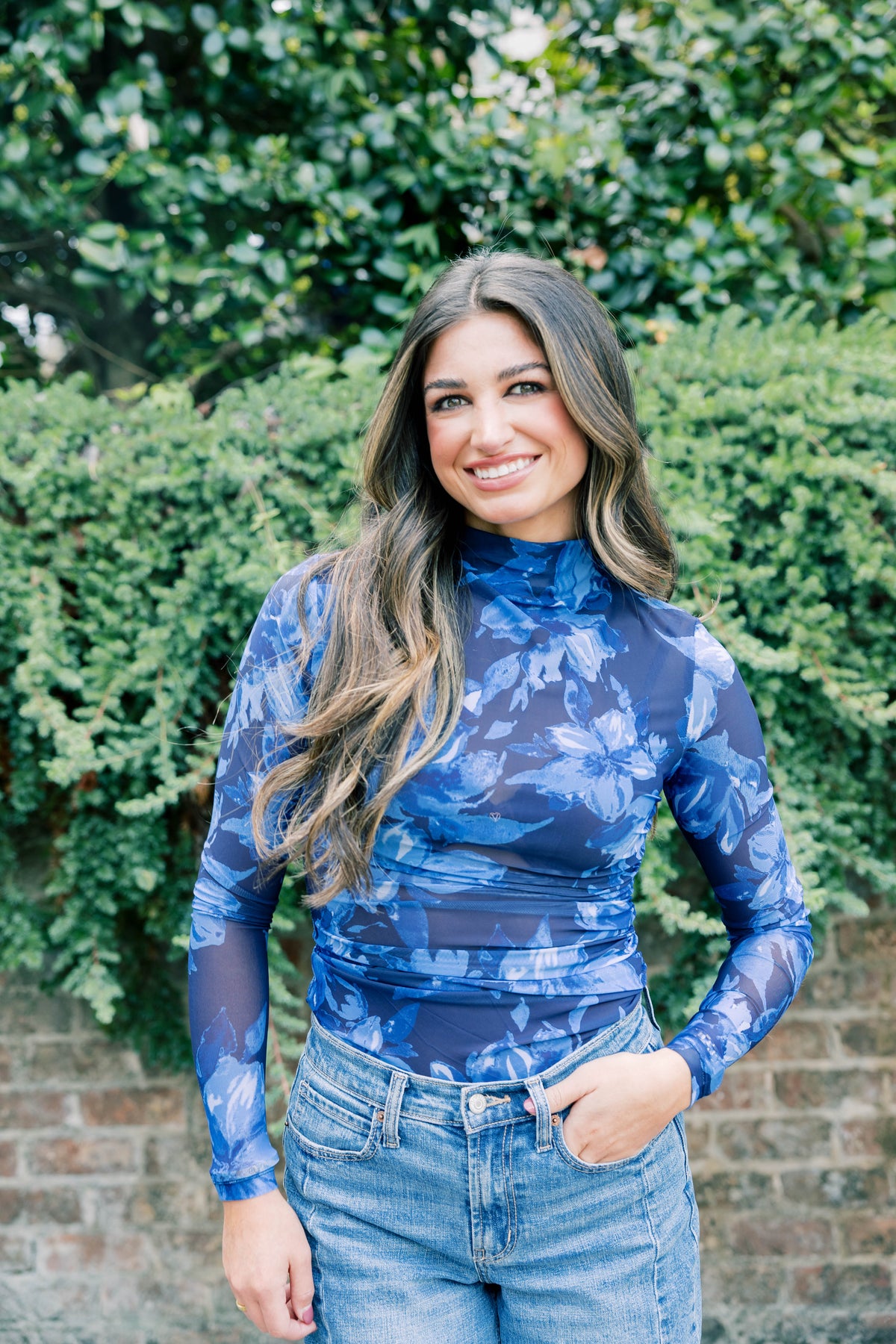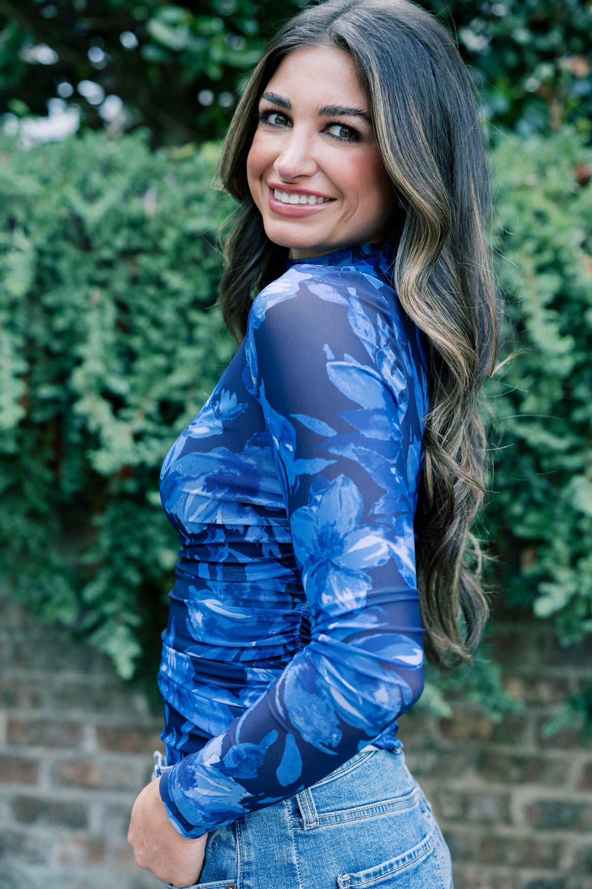 This printed power mesh top showcases a high neckline, long sleeves, and