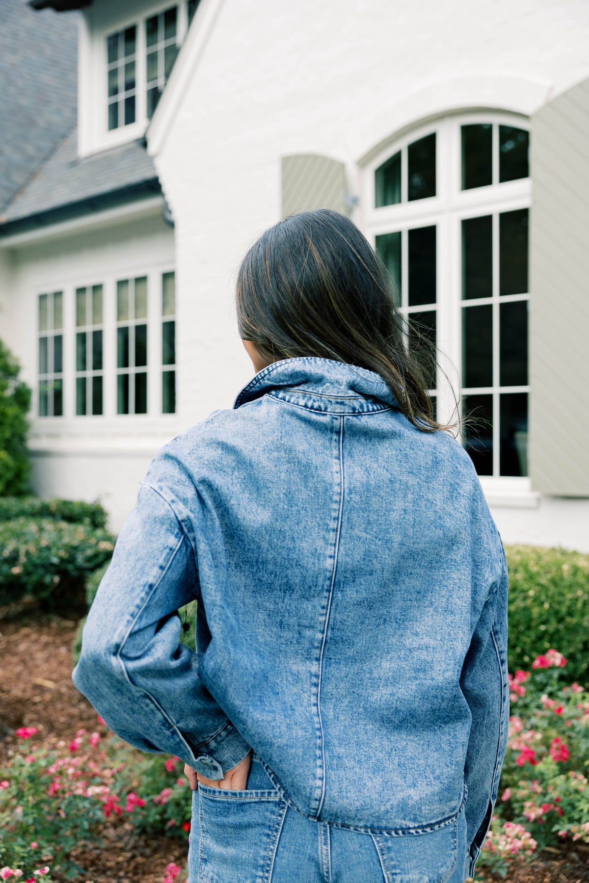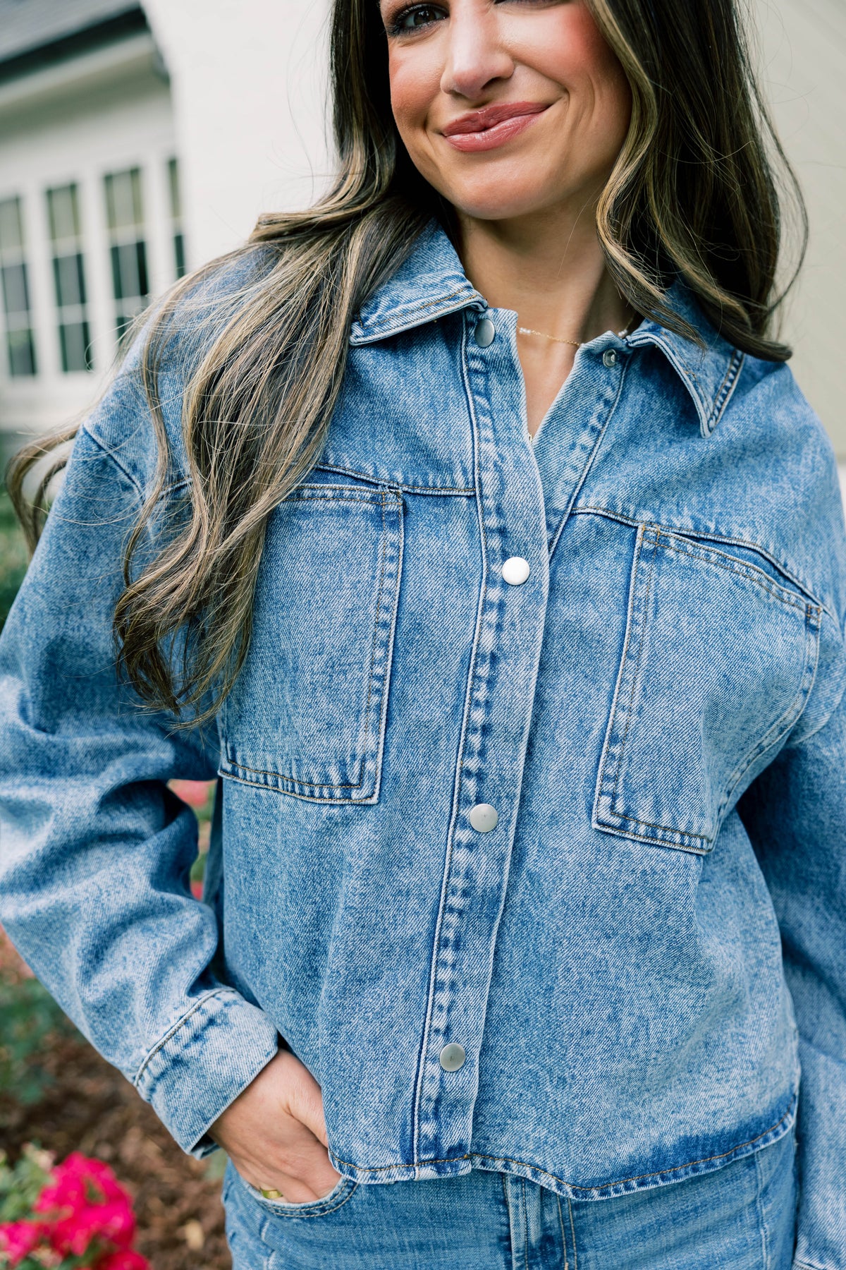 This Kali Denim Jacket offers a relaxed silhouette complemented by stylish pocket accents. Crafted with woven fabric for durability and comfort.