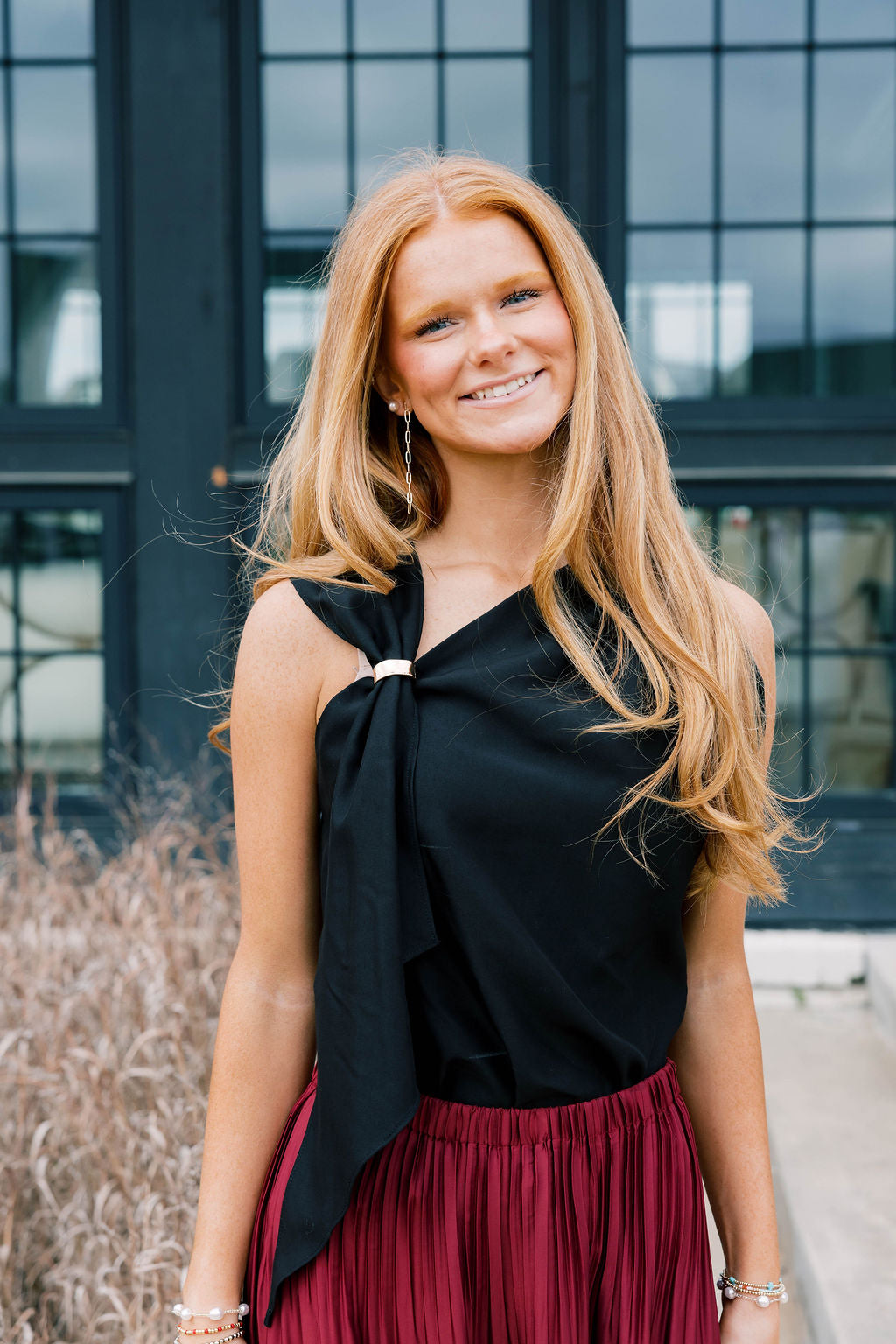 This lightweight woven top features a soft drape and an asymmetric neckline