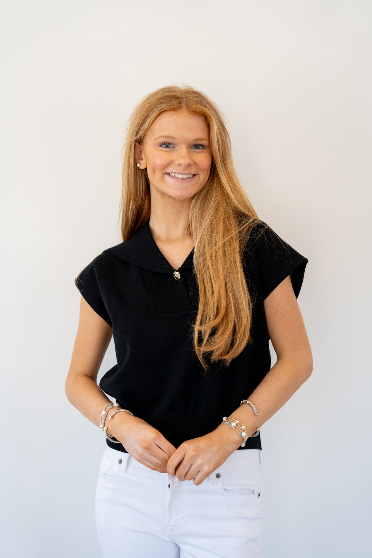 A versatile knit essential with timeless nautical appeal, this cap sleeve top showcases a striking wide sailor collar that wraps elegantly from front to back. The structured button detail at the front adds polish, while ribbed hemming ensures a refined fit. Crafted from medium-weight knit fabric with a non-sheer construction, it's unlined for comfortable everyday wear. Perfect for layering or wearing solo, this piece transitions effortlessly from casual to polished looks.
