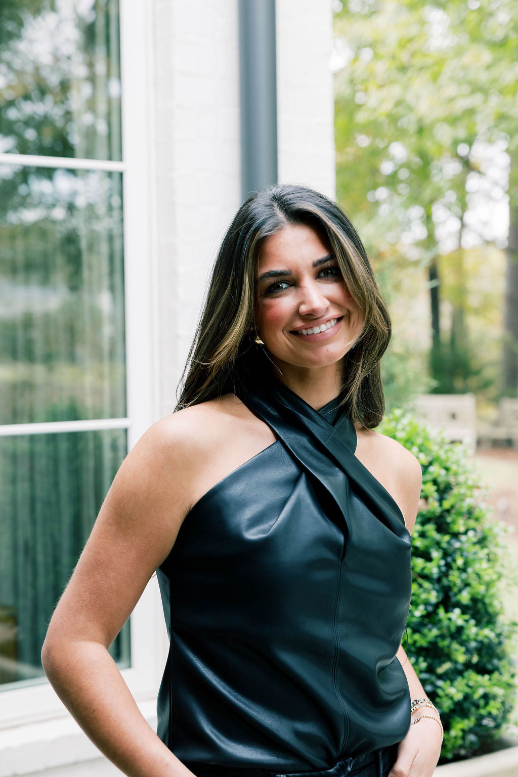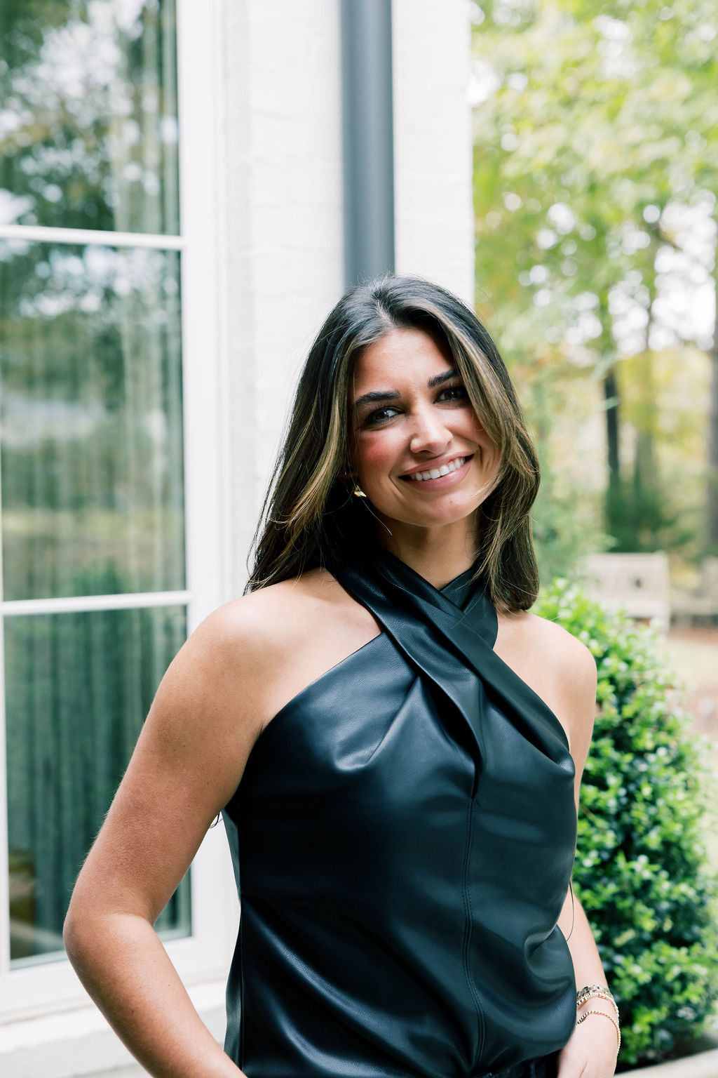 Crafted from soft faux leather, this sleeveless top features an eye-catching
